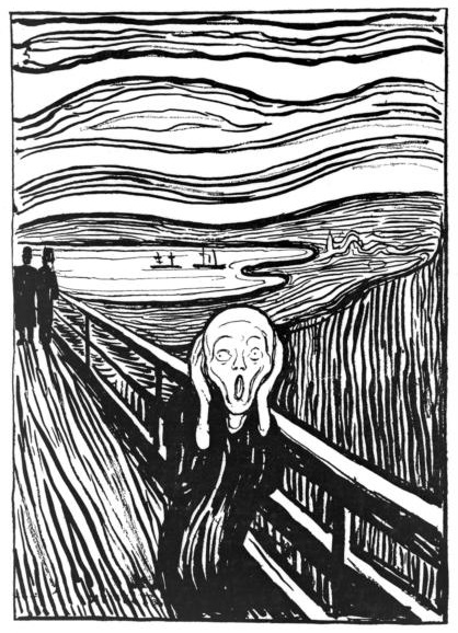 Ένα από τα πιο γνωστά έργα στην ιστορία της τέχνης. Μια ανθρώπινη φιγούρα στέκεται σε μια γέφυρα και κρατάει το κεφάλι της, φωνάζοντας δυνατά. Τα χρώματα και οι γραμμές δείχνουν έντονα συναισθήματα φόβου, αγωνίας και μοναξιάς.