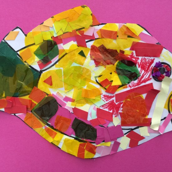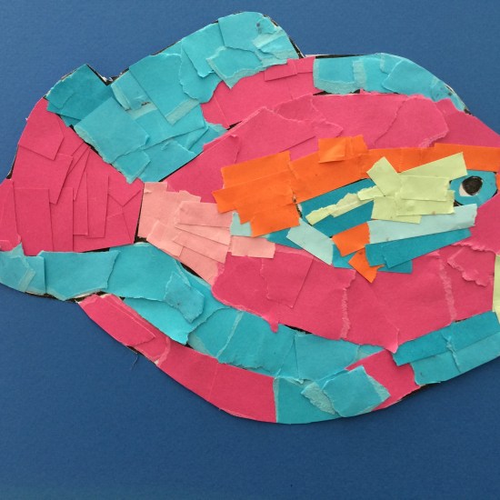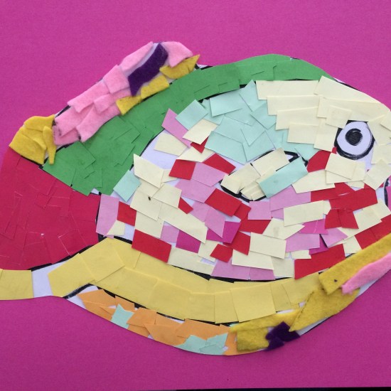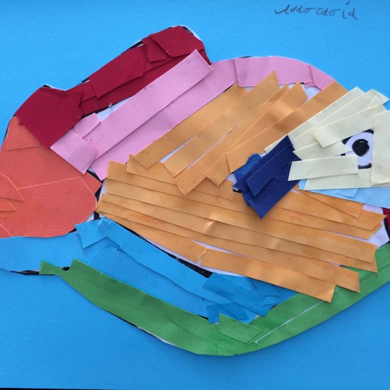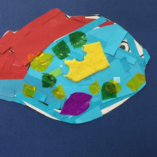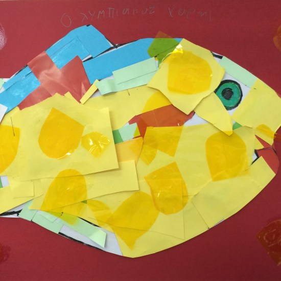Εξηγήσαμε την τεχνική του κολάζ, πως δηλαδή δημιουργείται μια εικόνα από κομμάτια υφάσματος ή χαρτιού αλλά και από άλλα υλικά κολλημένα μεταξύ τους. Στη συνέχεια, “χρωματίσαμε” με κομμάτια χρωματιστού χαρτιού και ζελατίνας το σχέδιο ενός ψαριού.
