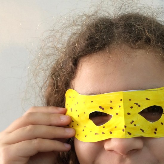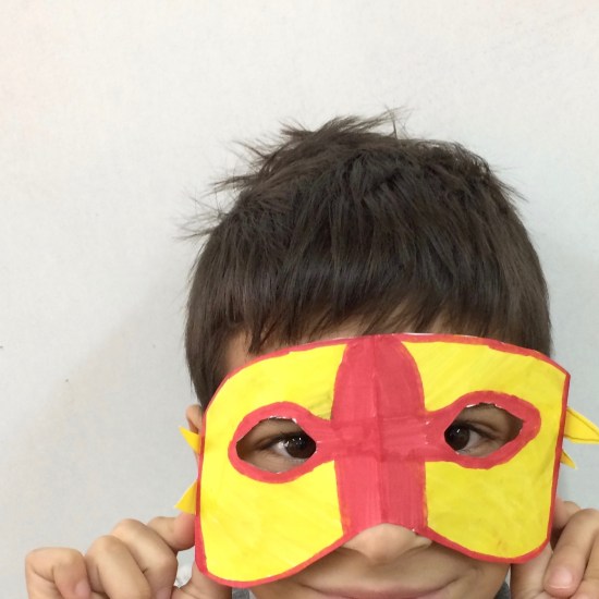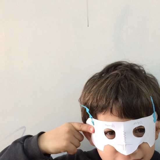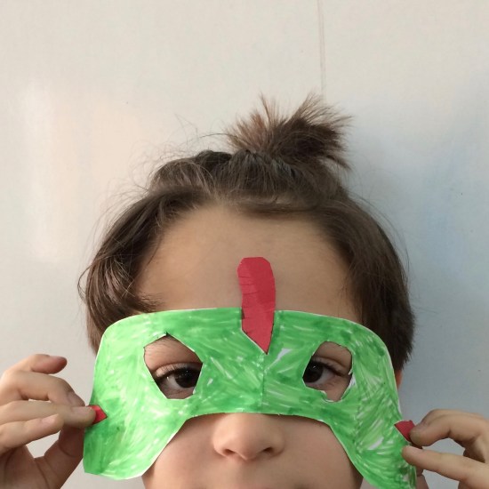Κατασκευάσαμε πολλές διαφορετικές μάσκες χρησιμοποιώντας φαντασία και εφευρετικότητα. Χρησιμοποιήσαμε τις παλάμες μας για τη βάση, καλαμάκια για να τις κρατάμε μπροστά στο πρόσωπο, λωρίδες από χαρτί για να τις στηρίξουμε στο κεφάλι. Μάθαμε πως μπορούμε να διπλώσουμε στη μέση το χαρτί και να κόψουμε μια μάσκα προσώπου με πανομοιότυπα μάτια. Διακοσμήσαμε ελεύθερα με χρωματιστά χαρτιά, μαρκαδόρους και ξυλομπογιές.