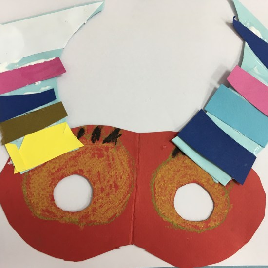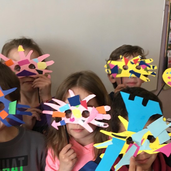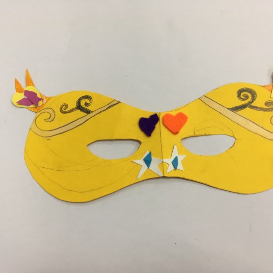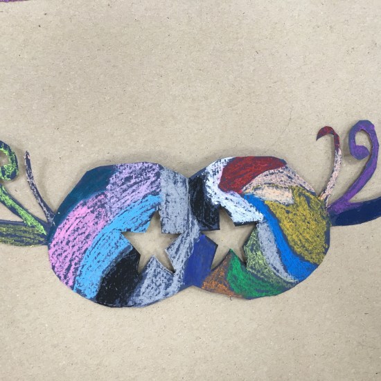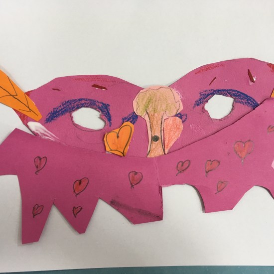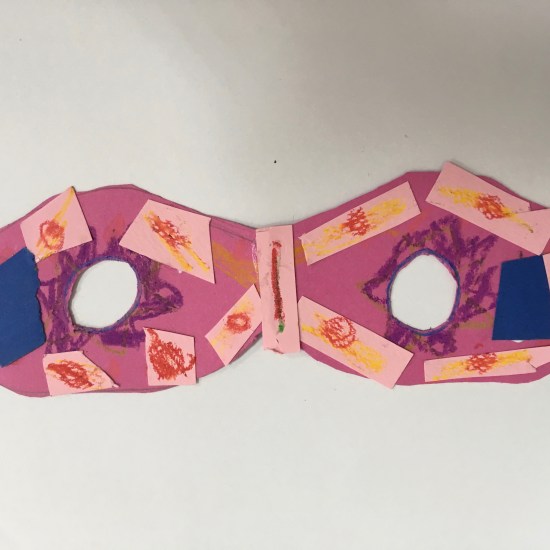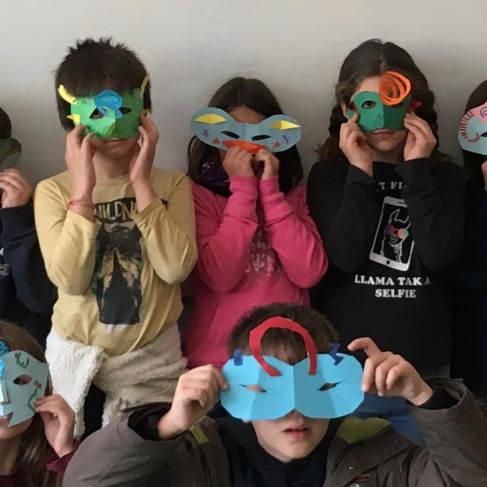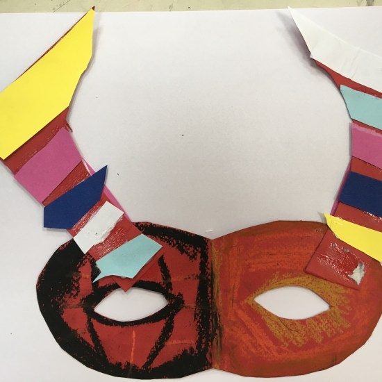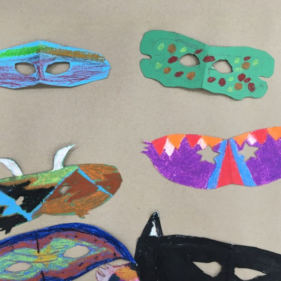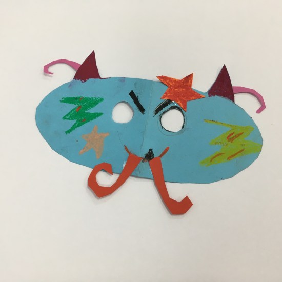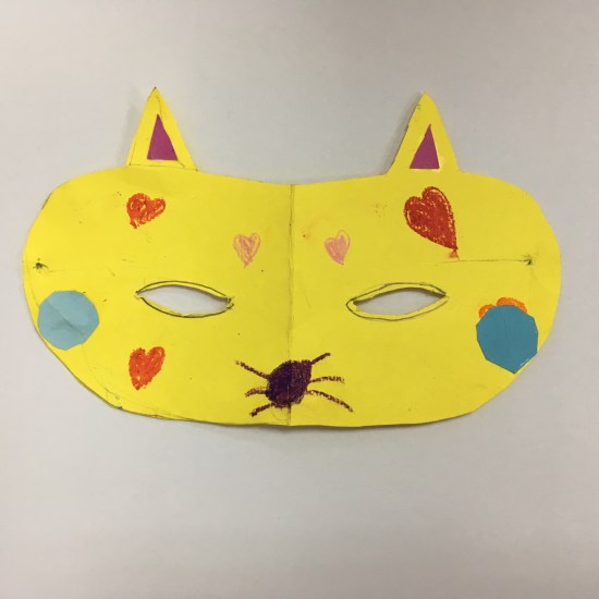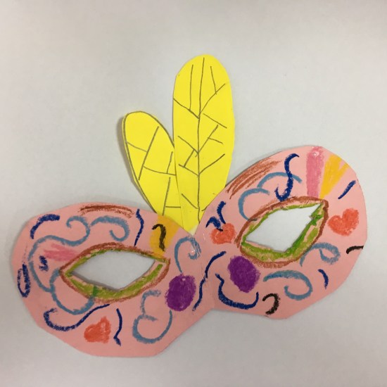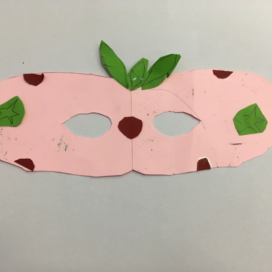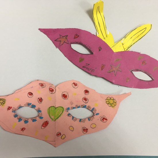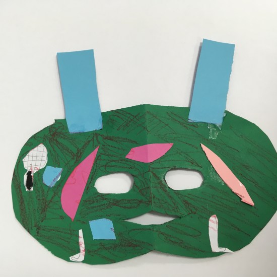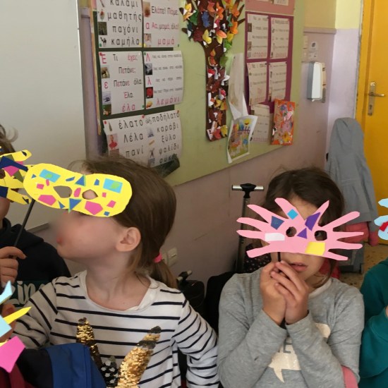 Κατασκευάσαμε πολλές διαφορετικές μάσκες χρησιμοποιώντας φαντασία και εφευρετικότητα. Χρησιμοποιήσαμε τις παλάμες μας για τη βάση και καλαμάκια για να τις κρατάμε μπροστά από το πρόσωπο. Μάθαμε πως μπορούμε να διπλώσουμε στη μέση το χαρτί και να κόψουμε μια μάσκα προσώπου με πανομοιότυπα μάτια. Διακοσμήσαμε ελεύθερα με χρωματιστά χαρτιά, μαρκαδόρους, ξυλομπογιές και λαδοπαστέλ.