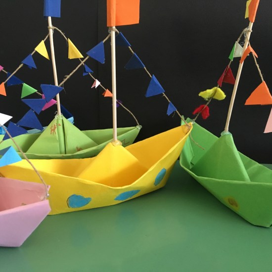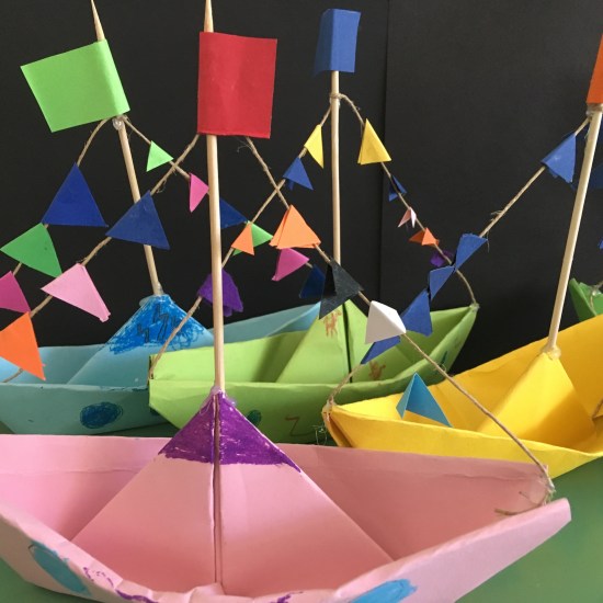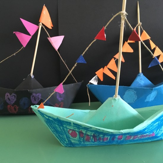 Διπλώσαμε χρωματιστά χαρτόνια με την τεχνική του origami για το γνωστό σε όλους μας χάρτινο καραβάκι. Το διακοσμήσαμε με λαδοπαστέλ και στο κατάρτι κρεμάσαμε χρωματιστά σημαιάκια.