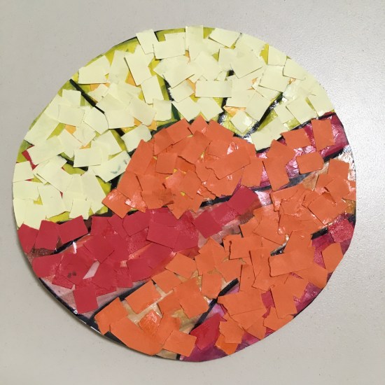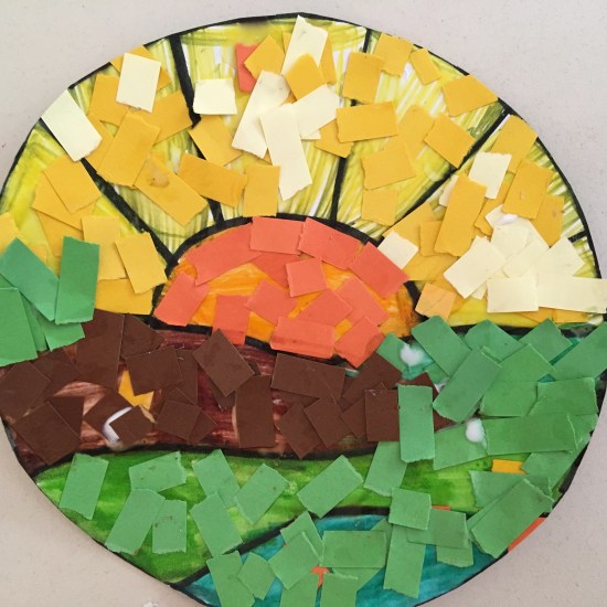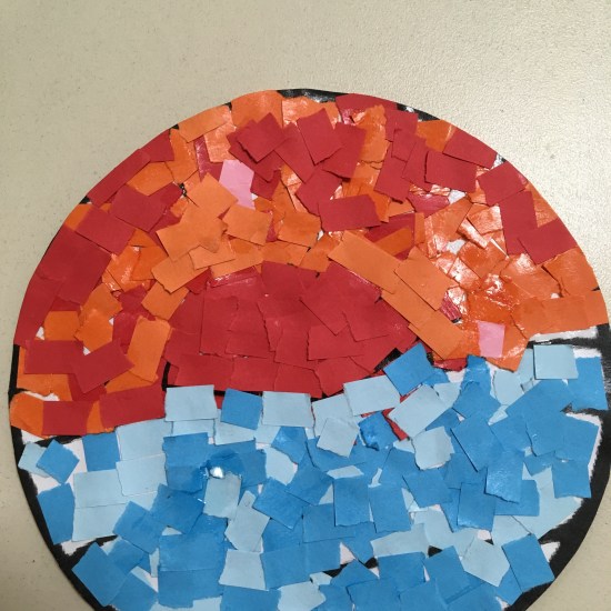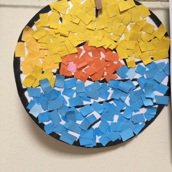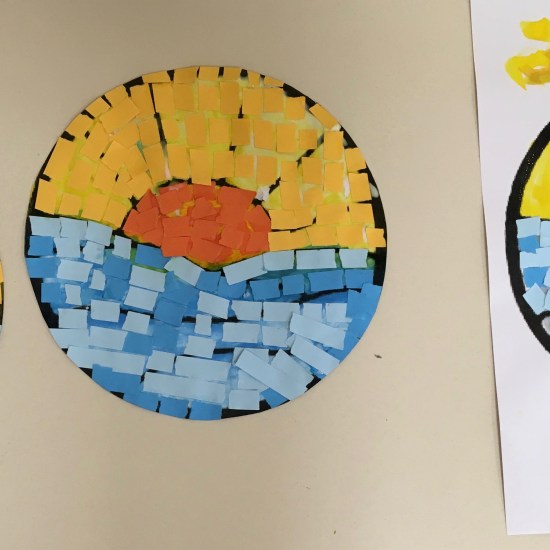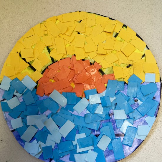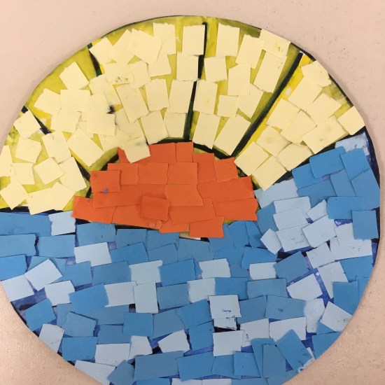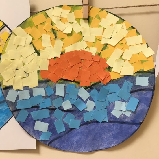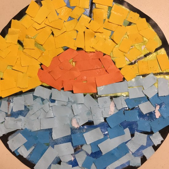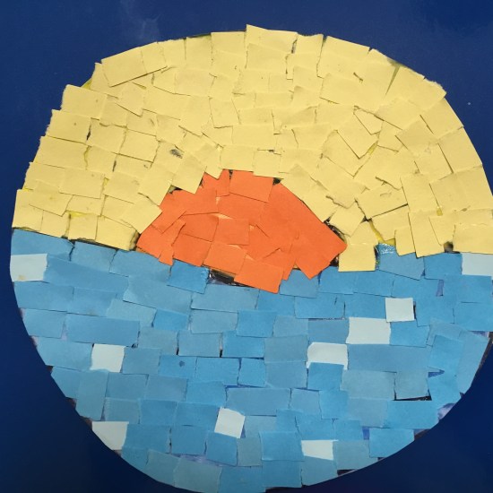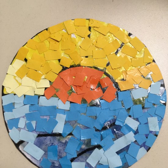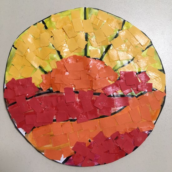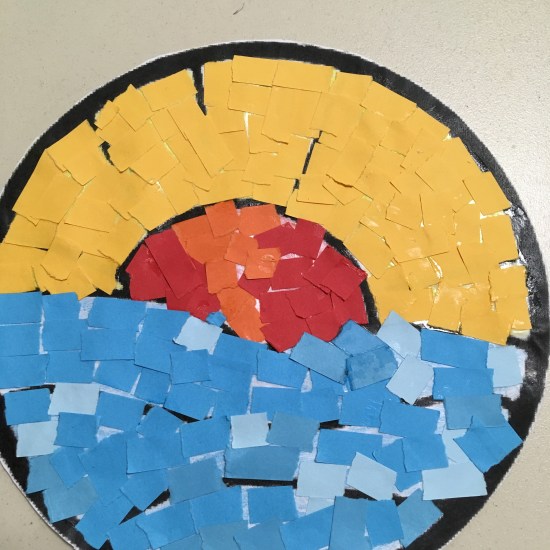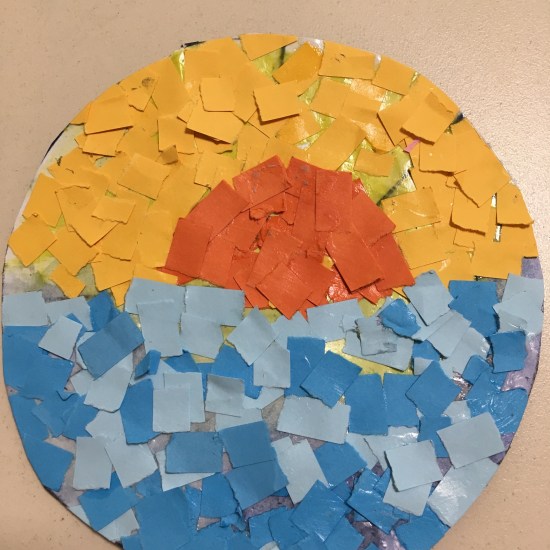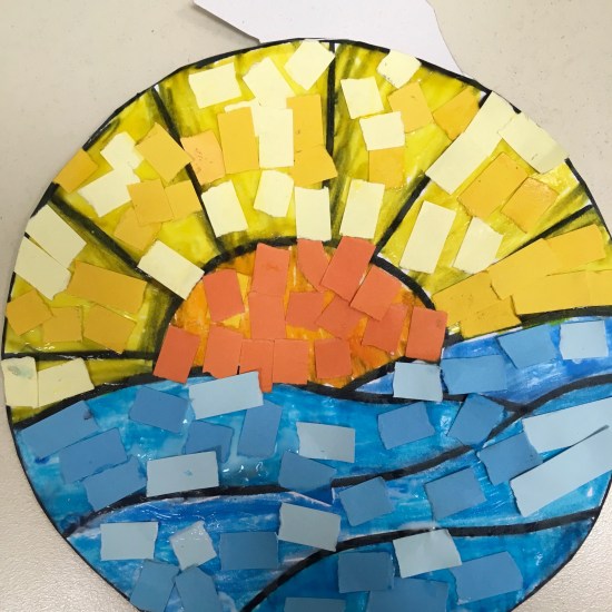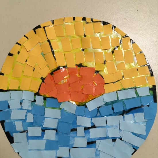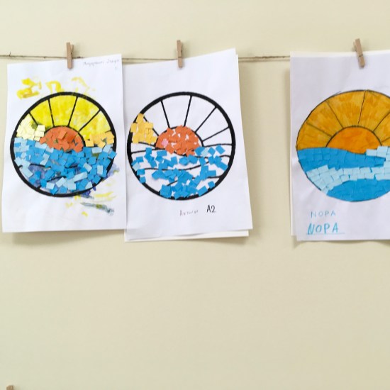 Χρωματίσαμε το δικό μας ηλιοβασίλεμα με νερομπογιές και στη συνέχεια καλύψαμε το έργο μας με χρωματιστά χαρτάκια. Εξάσκηση για την λεπτή κινητικότητα, συγκέντρωση για την ολοκλήρωση του έργου και ιδού το αποτέλεσμα!
