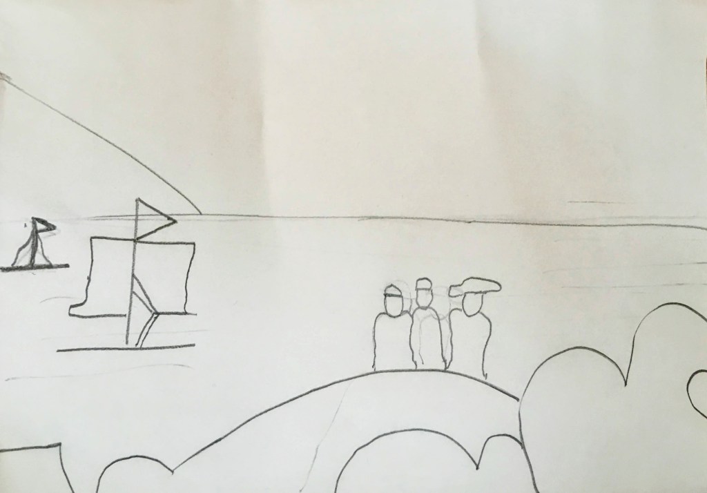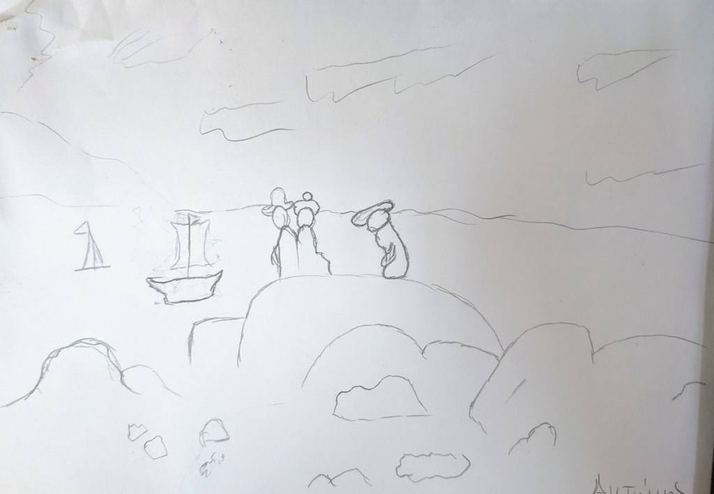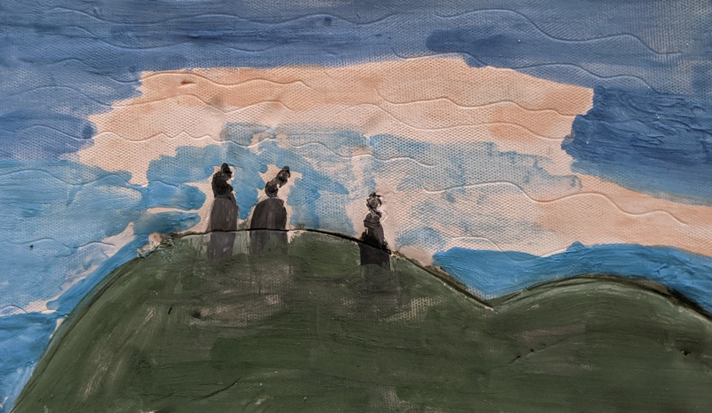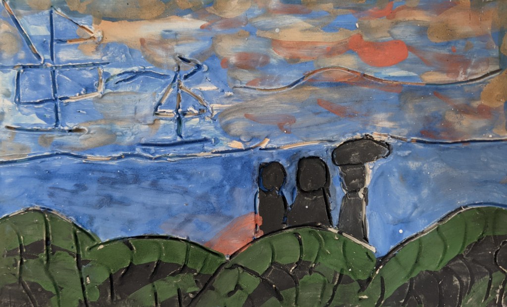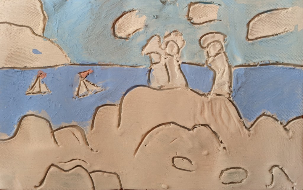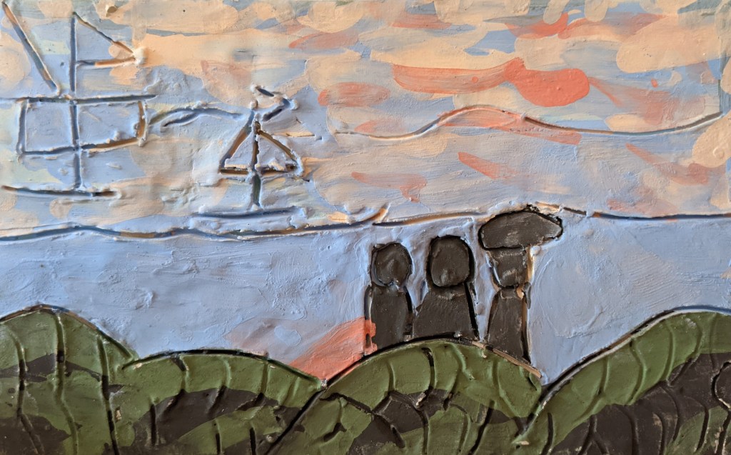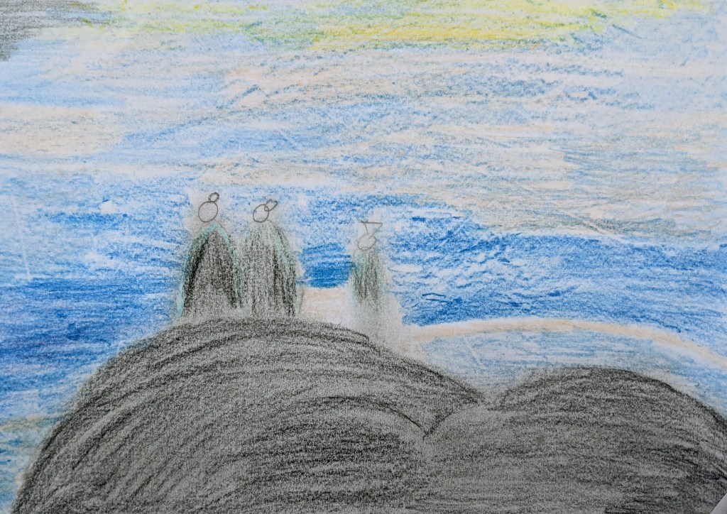 Στη συνέχεια, σχεδιάσαμε σε φύλλα πηλού με το δικό μας τρόπο το έργο του Φρήντριχ και το χρωματίσαμε με πηροχρώματα παρατηρώντας τα χρώματα στον πίνακά του.