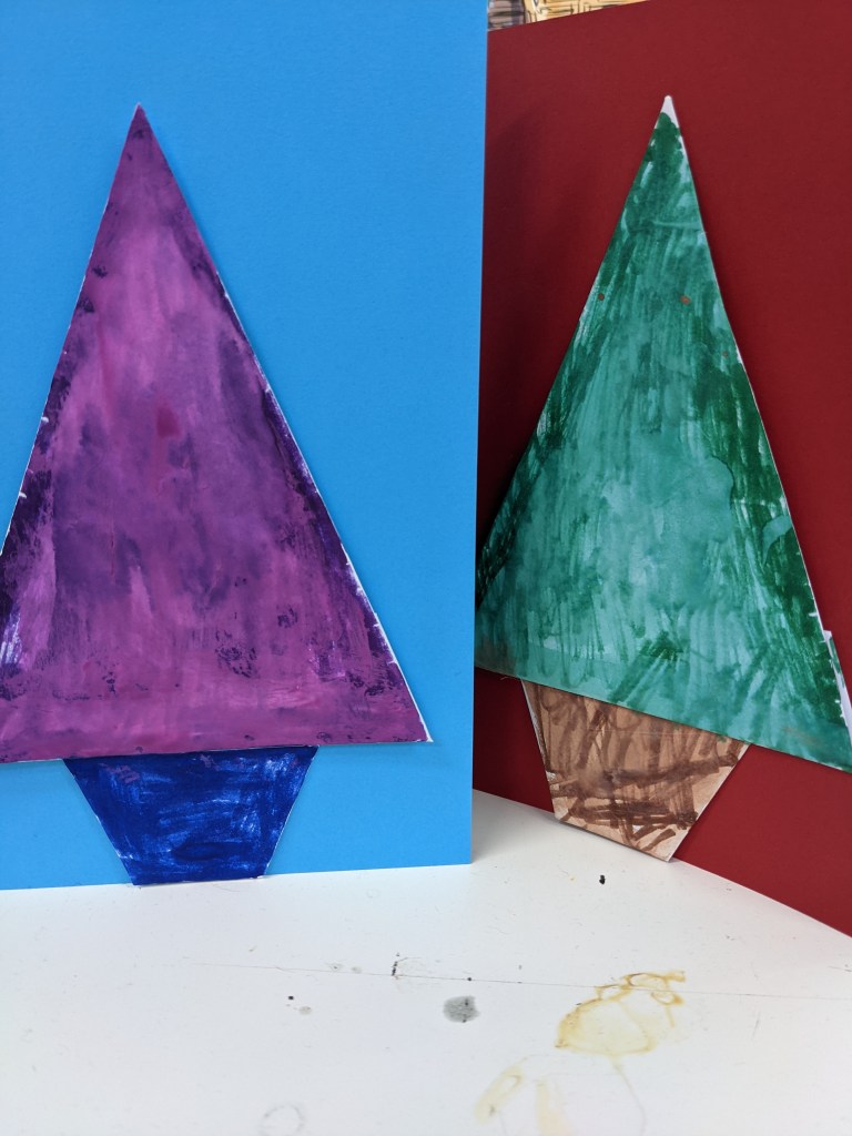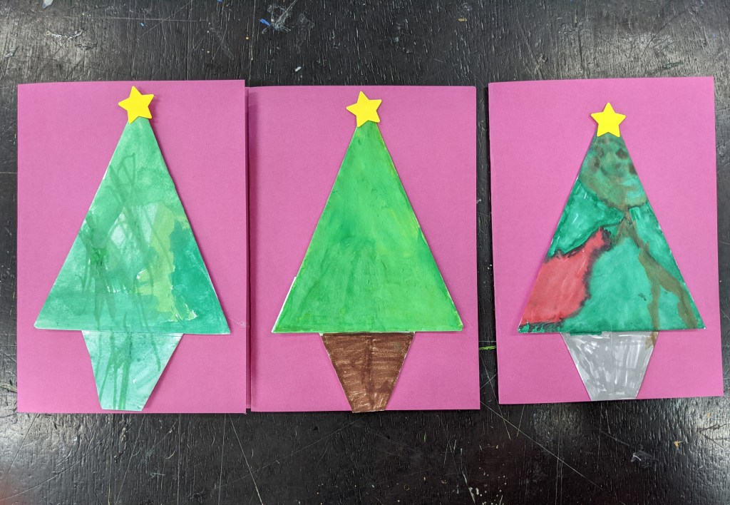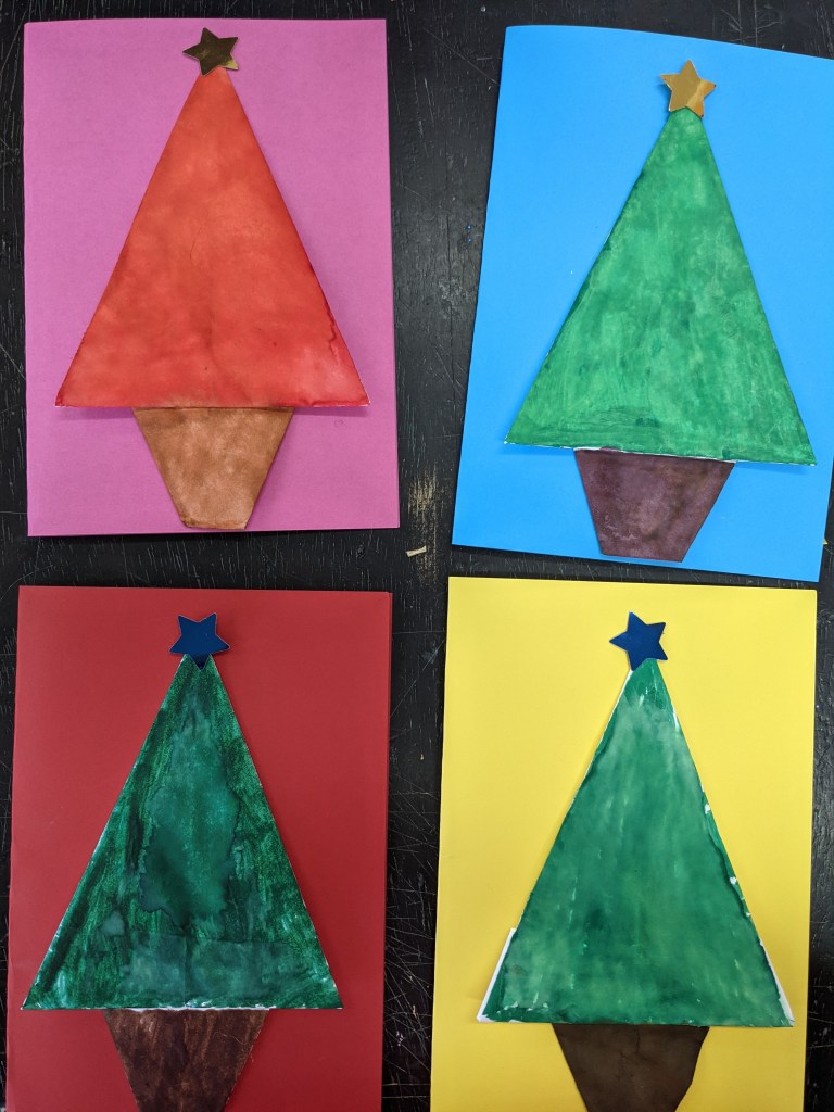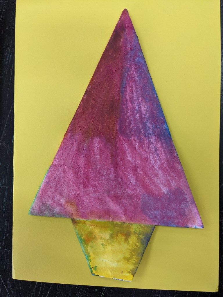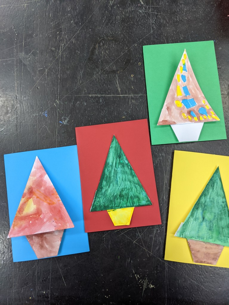 Διπλώσαμε τετράγωνο λευκό χαρτί, με την τεχνική origami, για να φτιάξουμε ένα χριστουγεννιάτικο δέντρο. Το χρωματίσαμε με μαρκαδόρους ή ξυλομπογιές και το κολλήσαμε σε χρωματιστή κάρτα από canson.