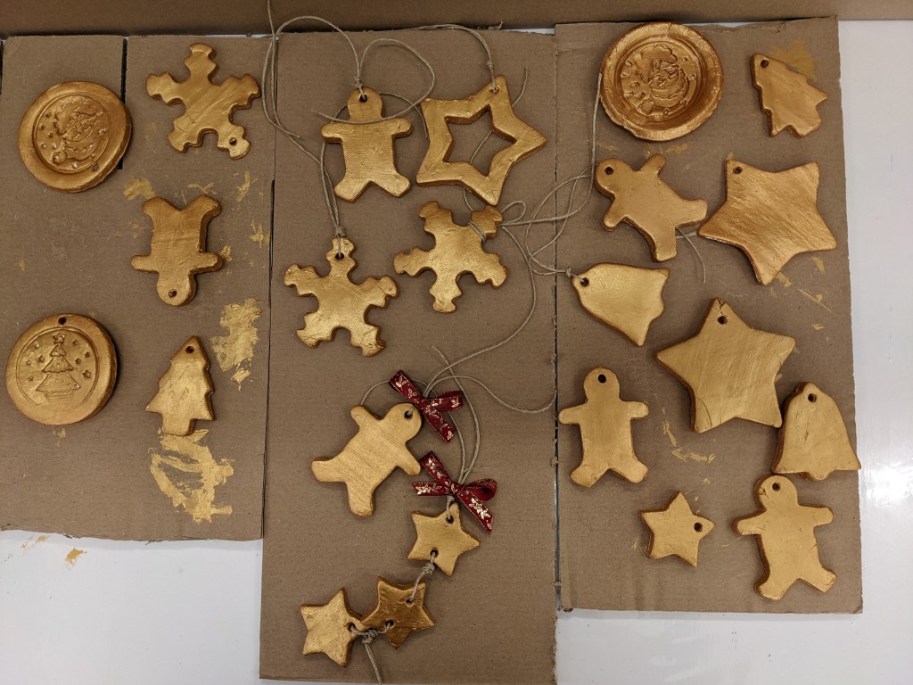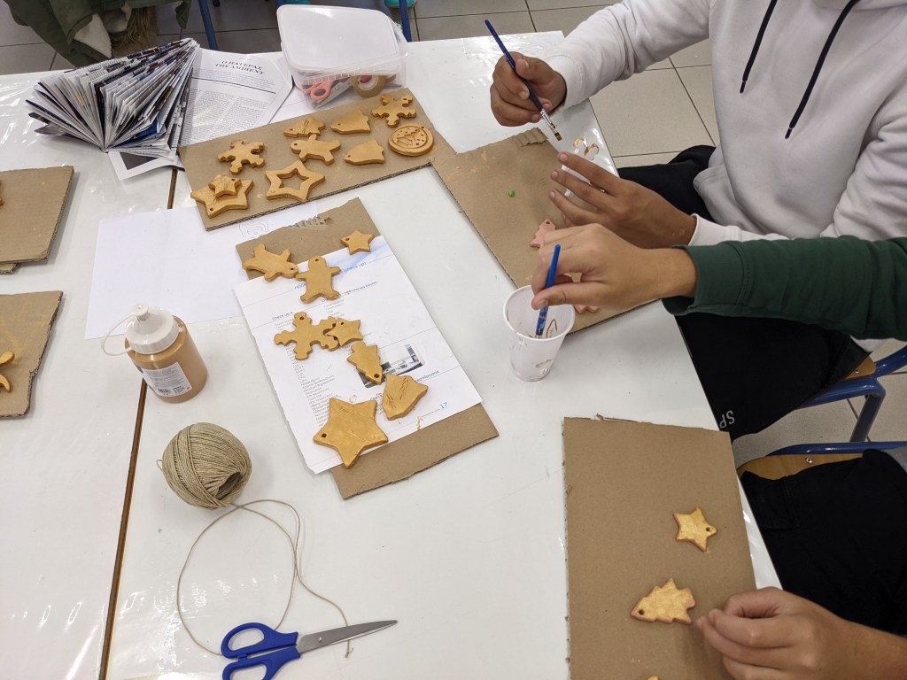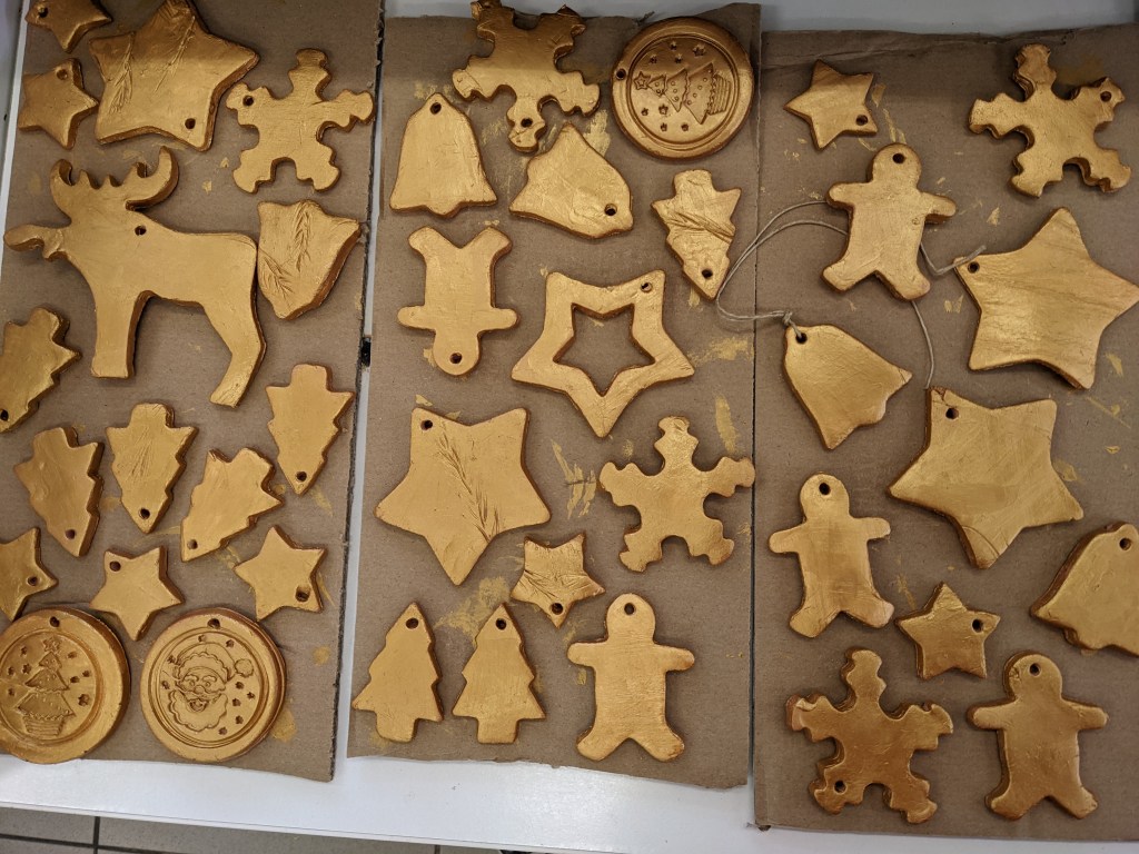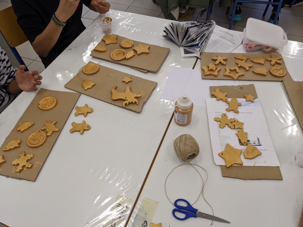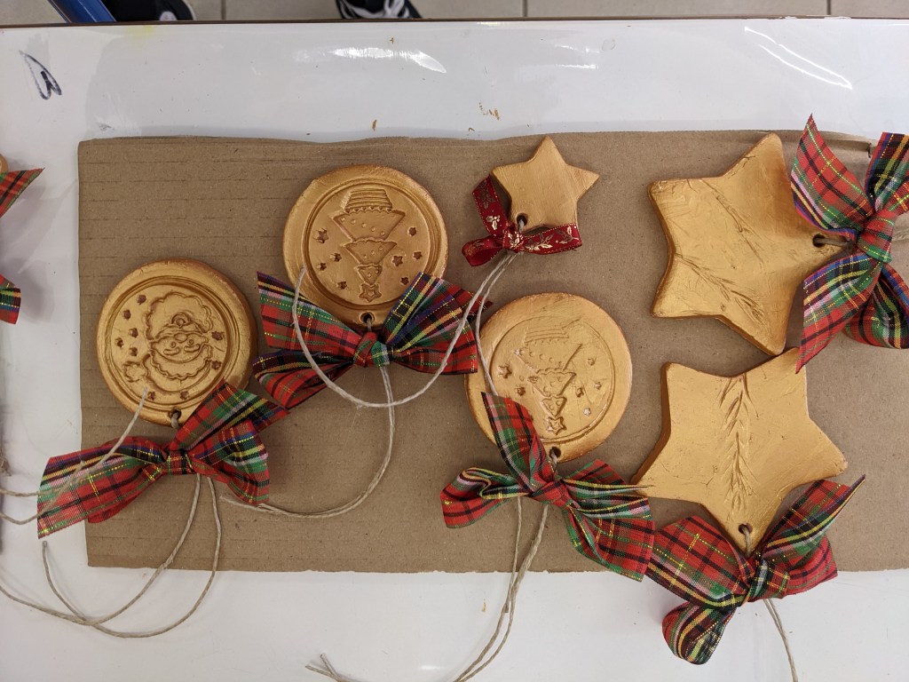 Οι μαθητές έφτιαξαν στολίδια από πηλό. Διδάχθηκαν τη χρήση πλάστη για το άνοιγμα του φύλλου, μια από τις βασικές τεχνικές της κεραμικής. Έκοψαν σχήματα με κουπάτ και αφού στέγνωσαν τα έβαψαν με χρυσή μπογιά.