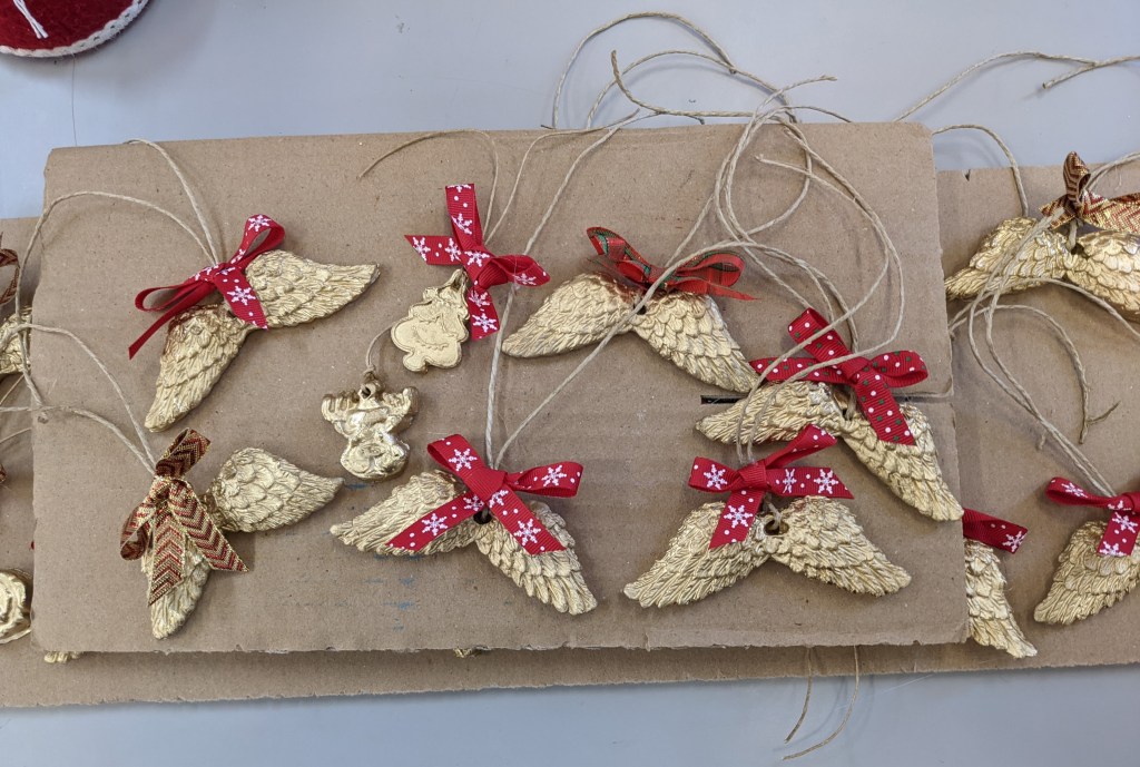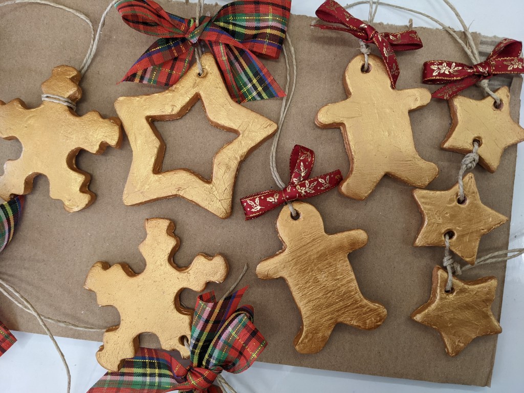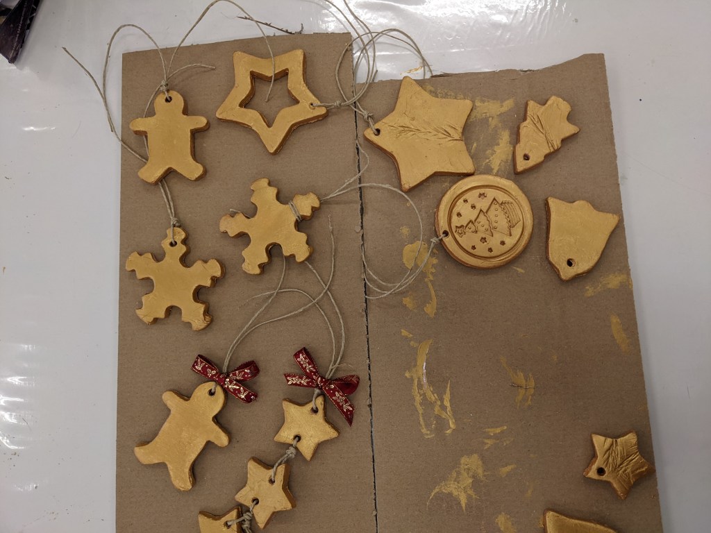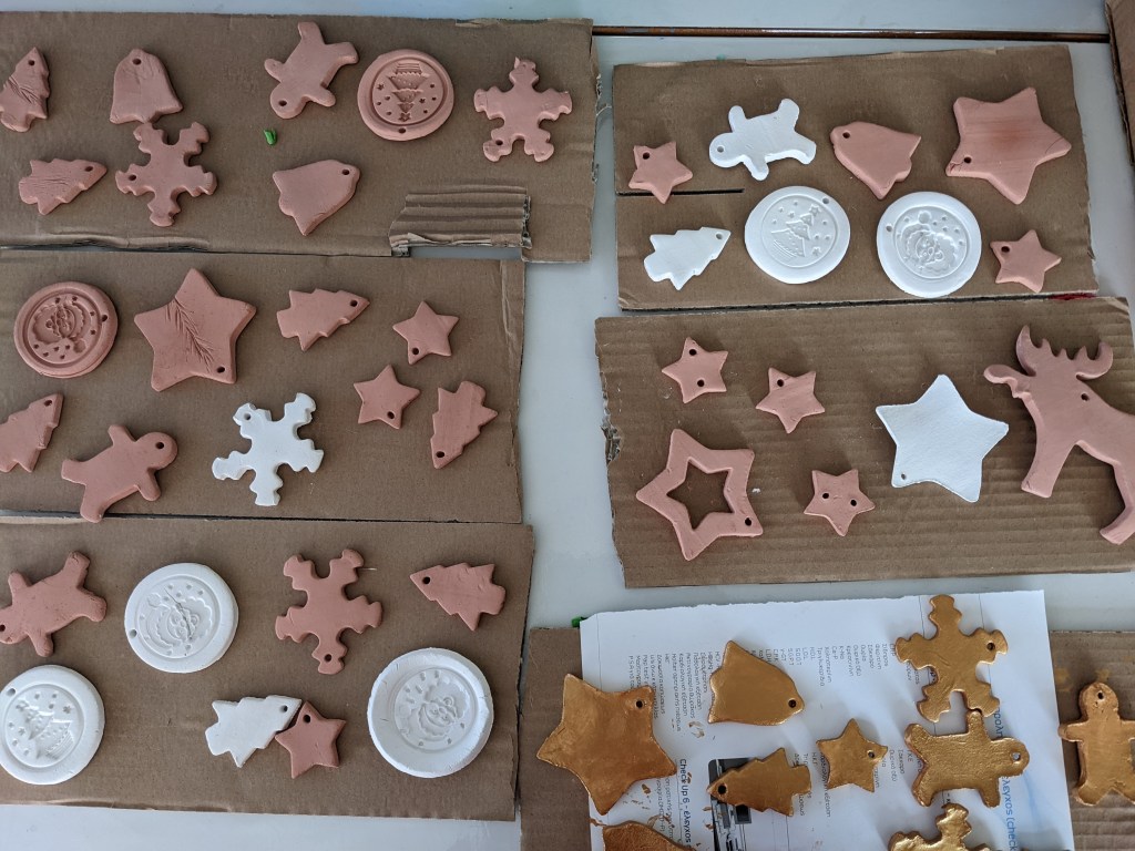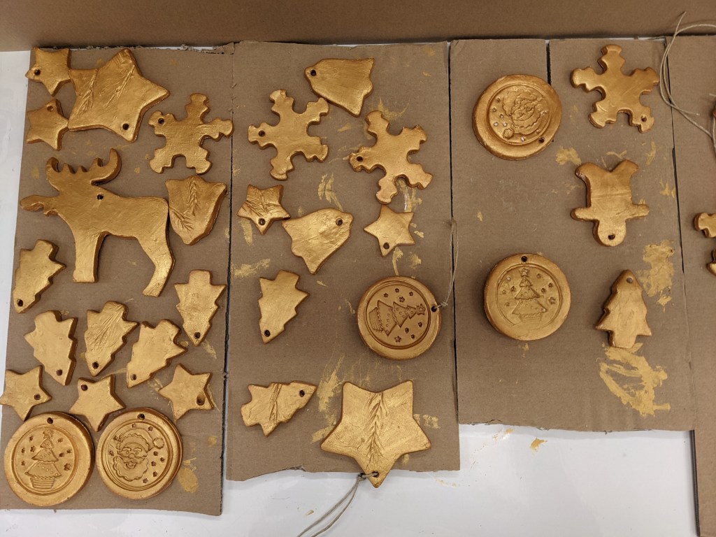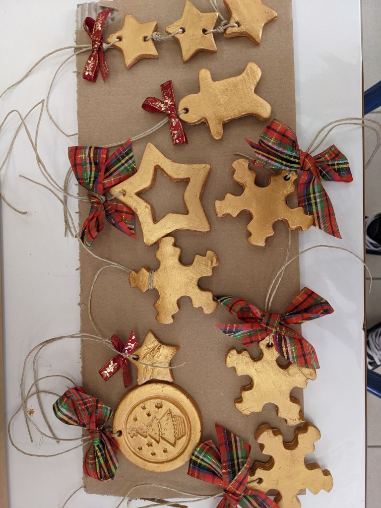 Οι μαθητές έφτιαξαν στολίδια από πηλό. Διδάχθηκαν τη χρήση πλάστη για το άνοιγμα του φύλλου, μια από τις βασικές τεχνικές της κεραμικής. Έκοψαν σχήματα με κουπάτ και αφού στέγνωσαν τα έβαψαν με χρυσή μπογιά.