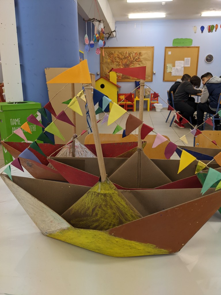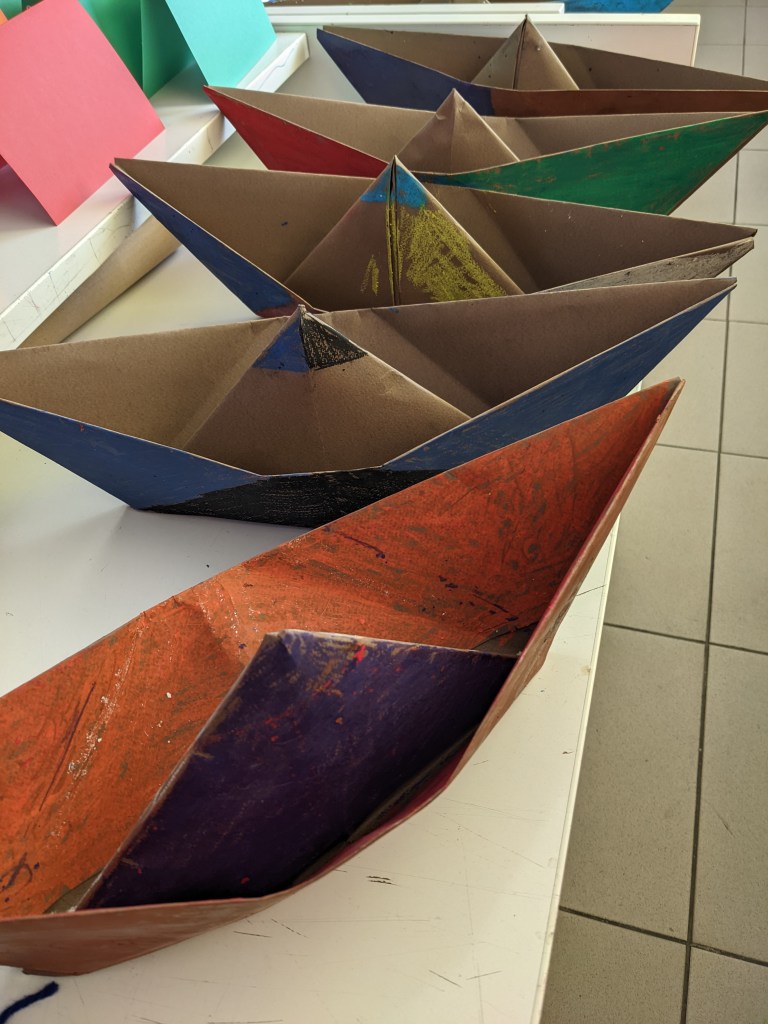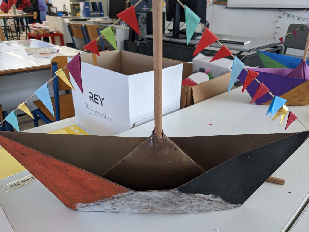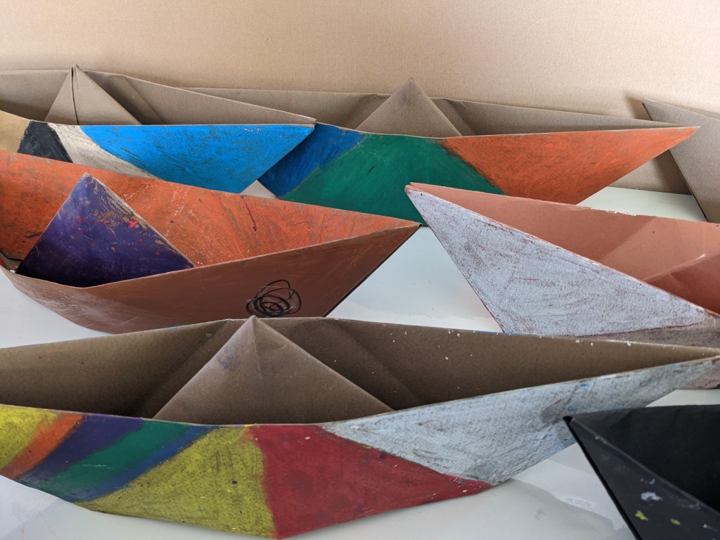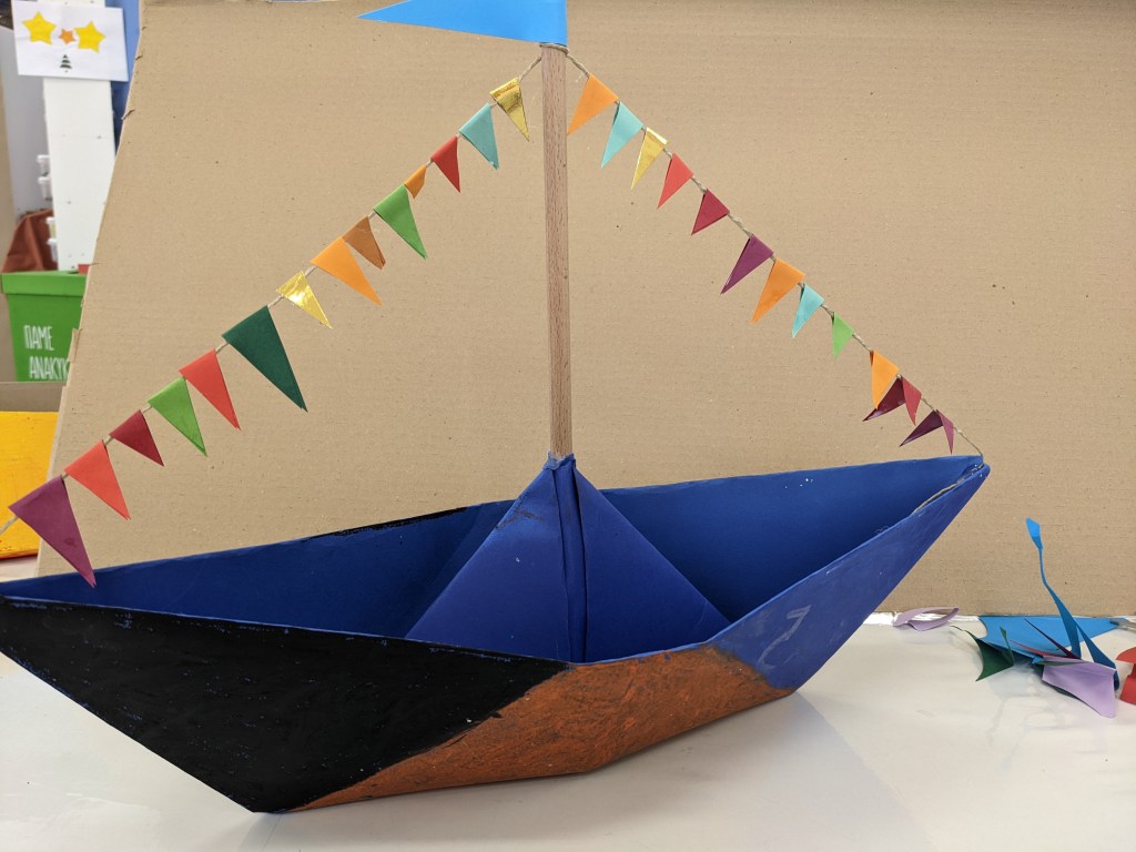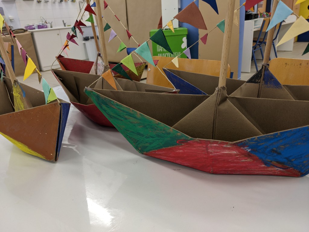 Κατασκευάσαμε χριστουγεννιάτικα καράβια με χαρτιά τύπου canson διαστάσεων 50×70 εκ. Τα χρωματίσαμε με λαδοπαστέλ και τα στολίσαμε με χρωματιστά σημαιάκια από χαρτί τύπου canson.