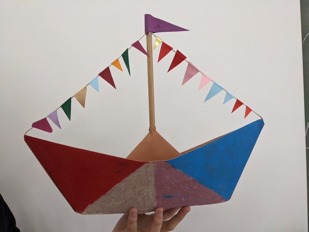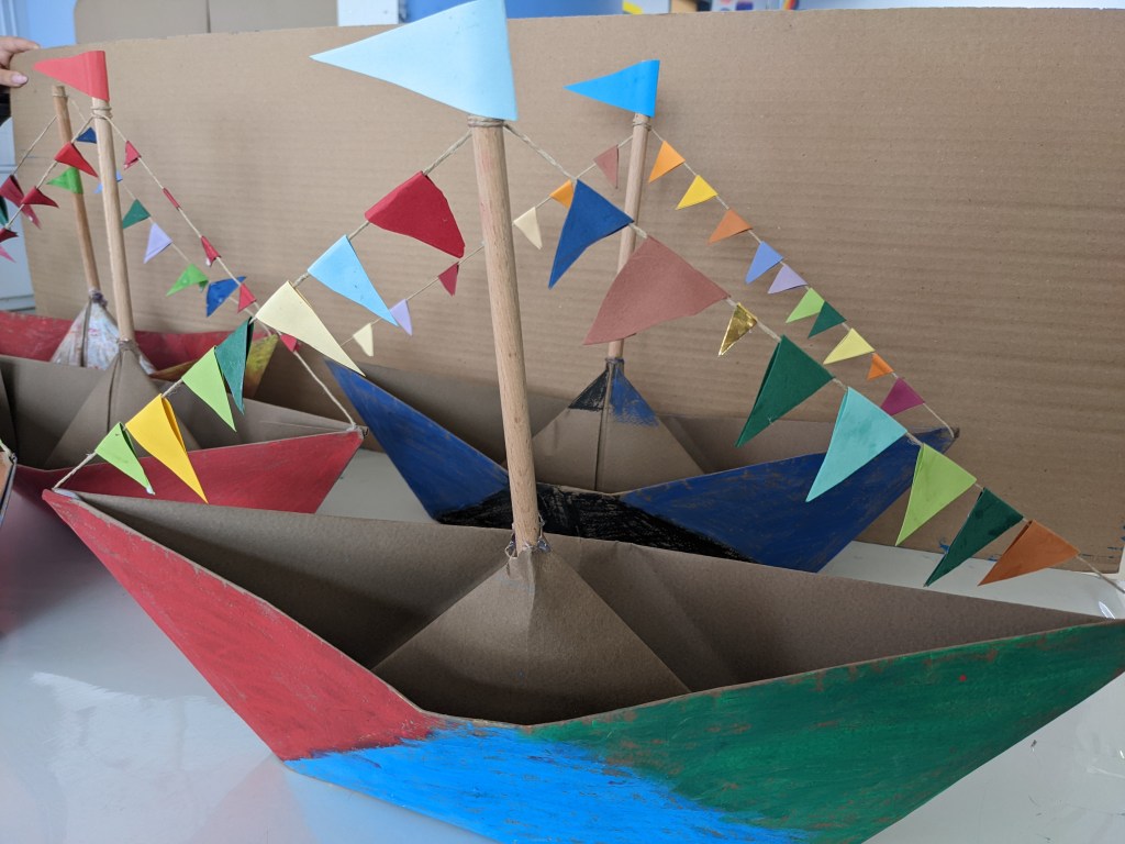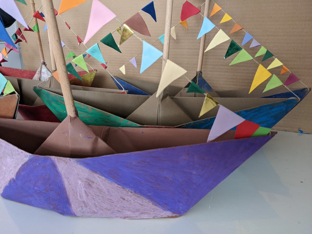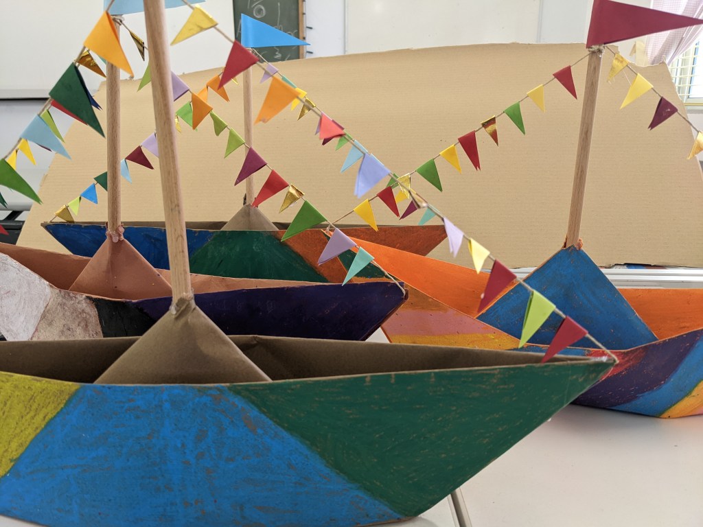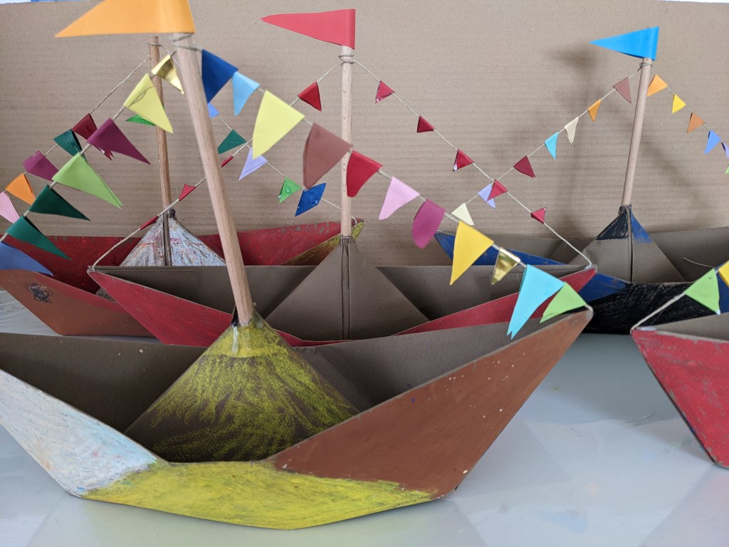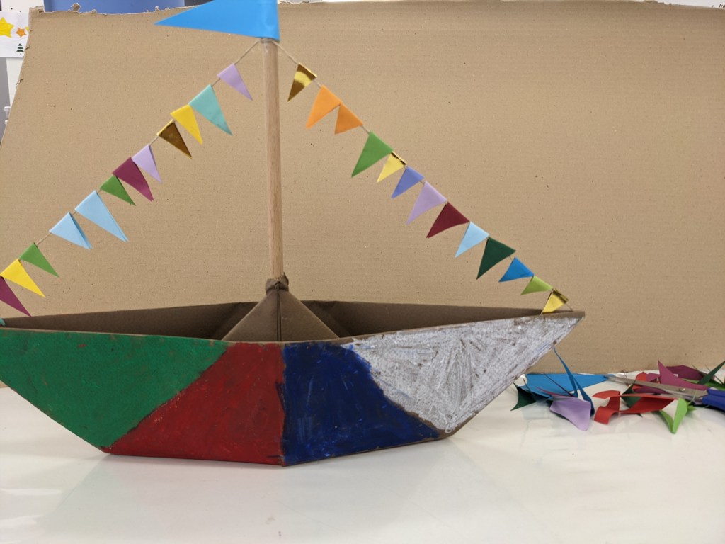 Κατασκευάσαμε χριστουγεννιάτικα καράβια με χαρτιά τύπου canson διαστάσεων 50×70 εκ. Τα χρωματίσαμε με λαδοπαστέλ και τα στολίσαμε με χρωματιστά σημαιάκια από χαρτί τύπου canson.