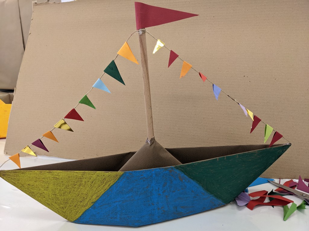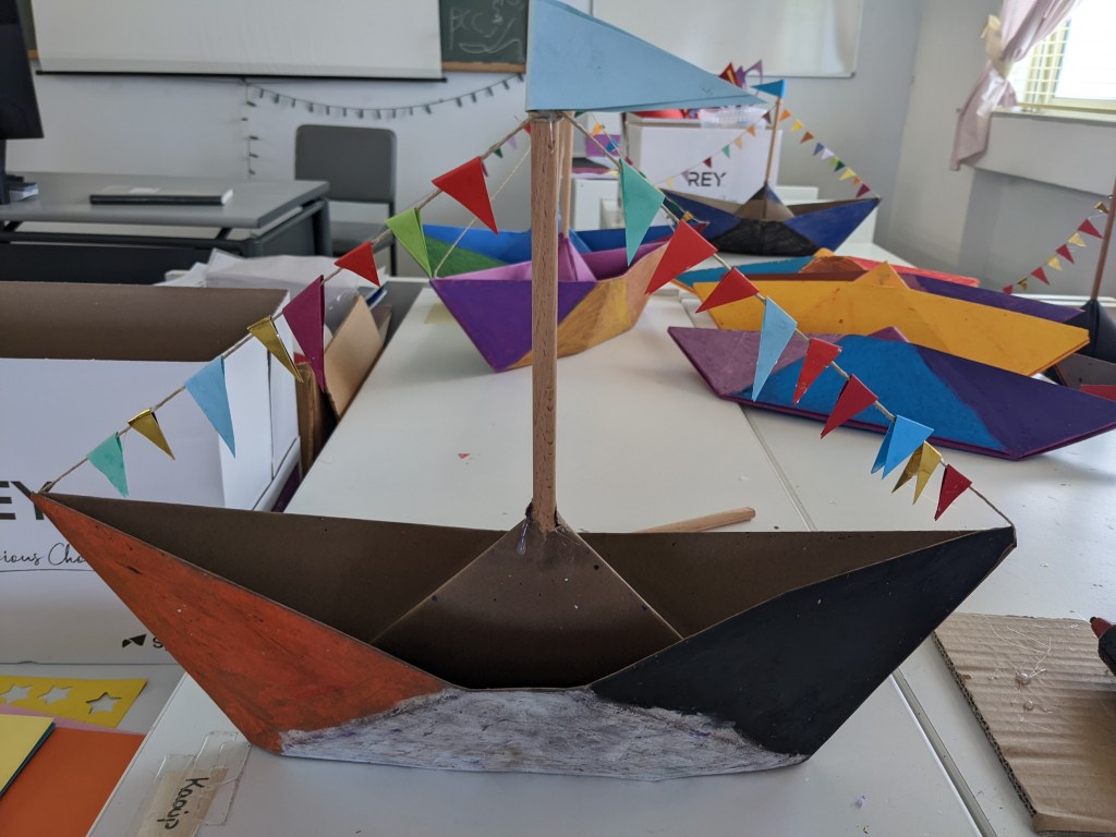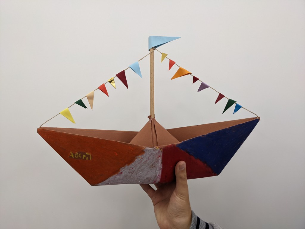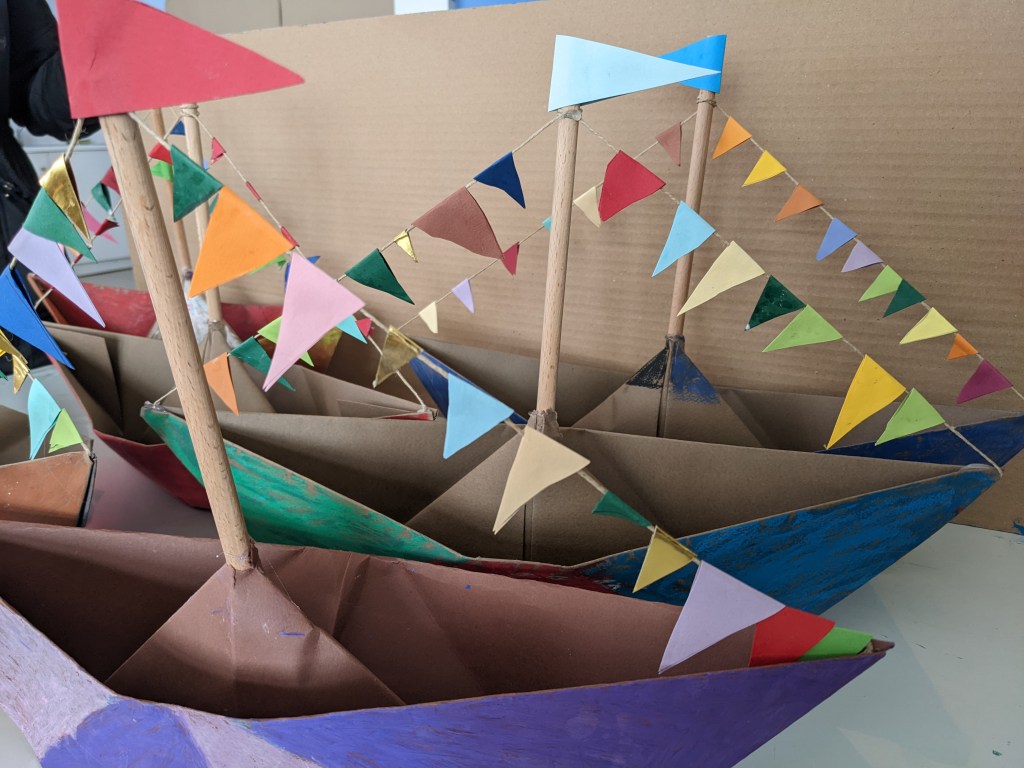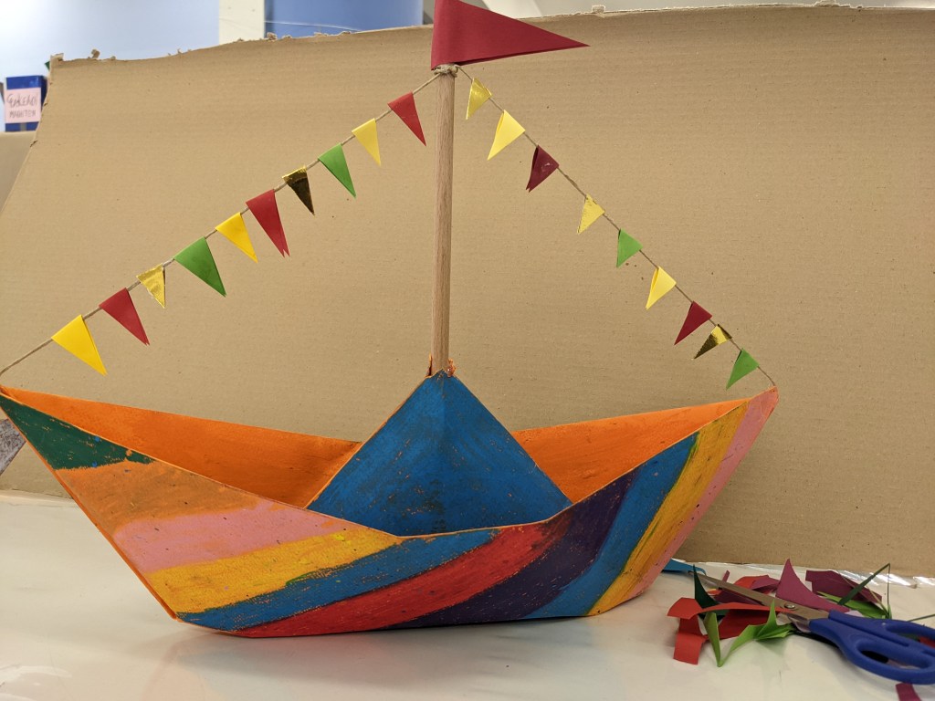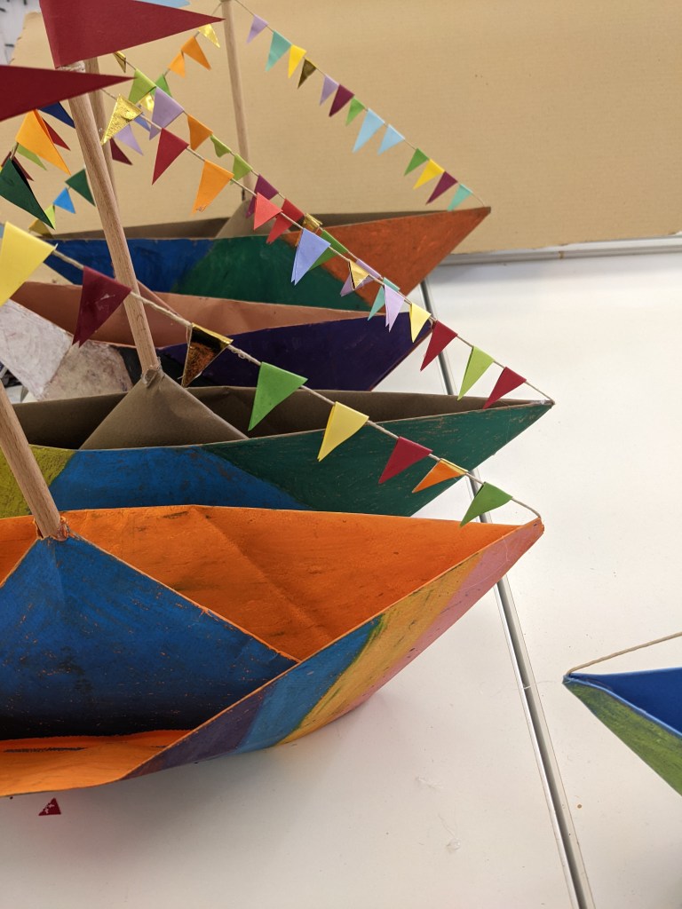 Κατασκευάσαμε χριστουγεννιάτικα καράβια με χαρτιά τύπου canson διαστάσεων 50×70 εκ. Τα χρωματίσαμε με λαδοπαστέλ και τα στολίσαμε με χρωματιστά σημαιάκια από χαρτί τύπου canson.