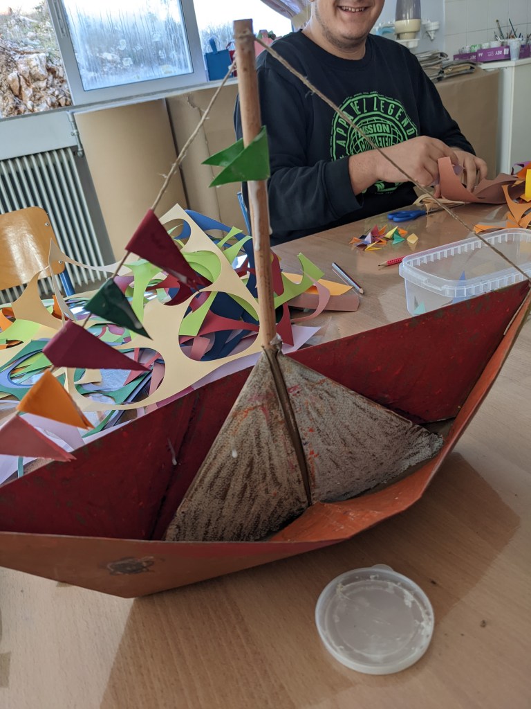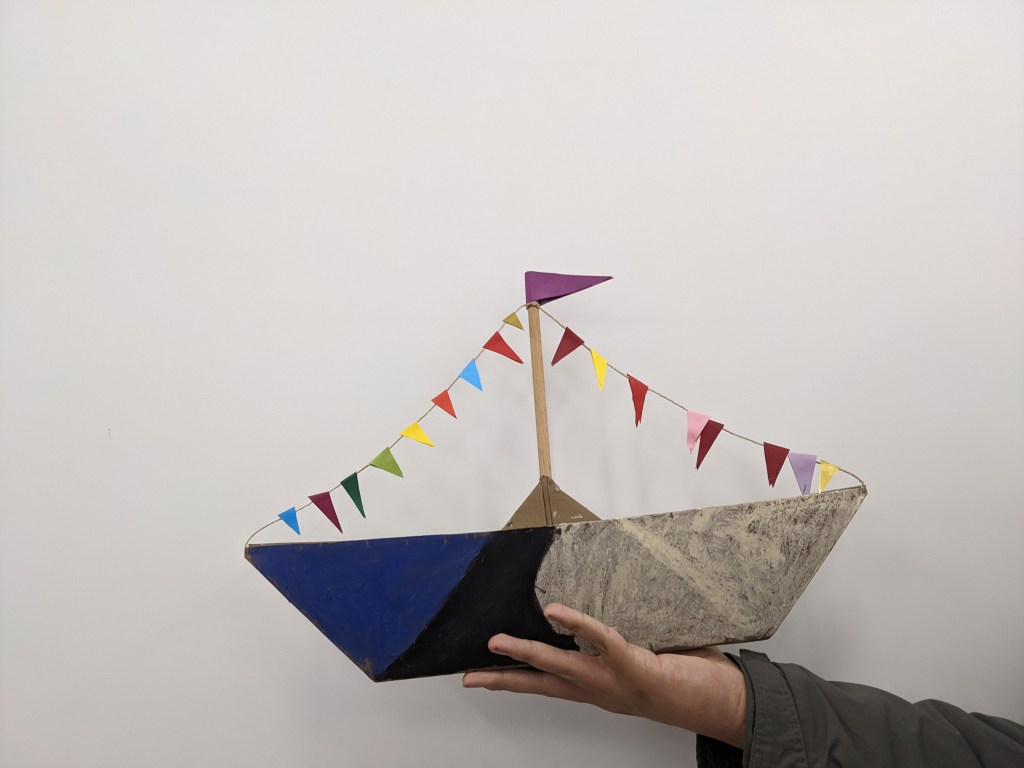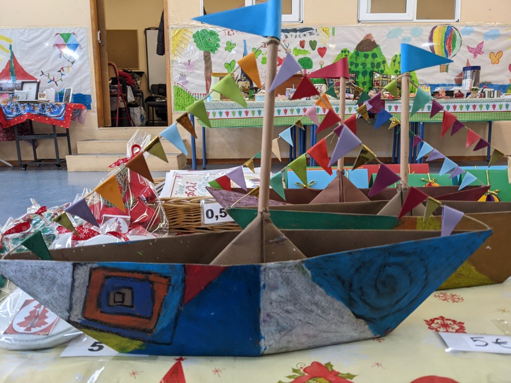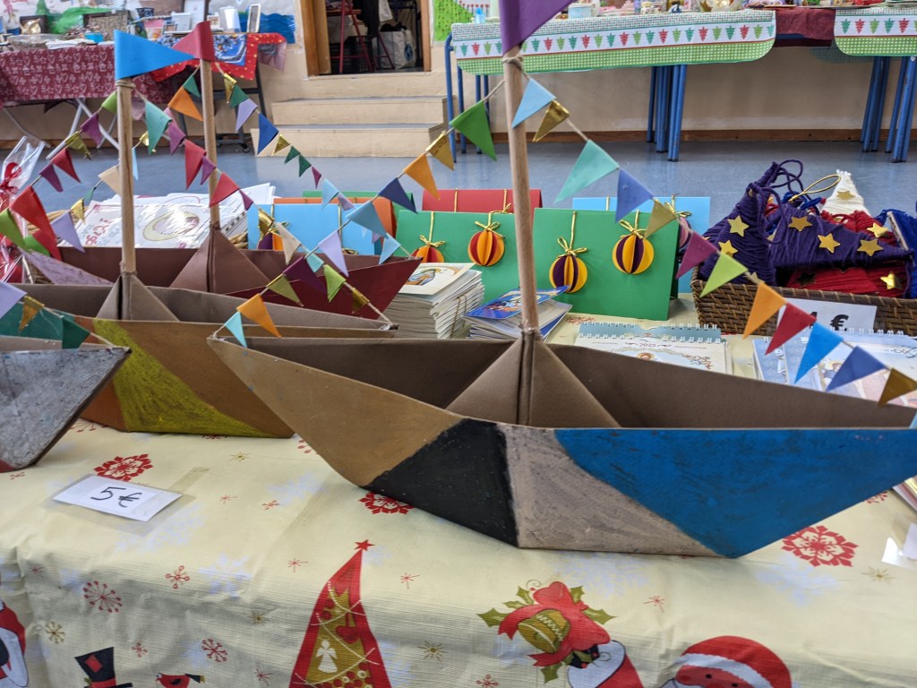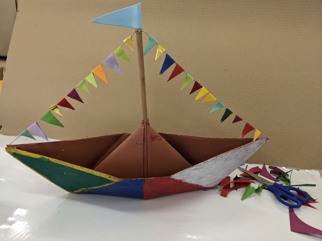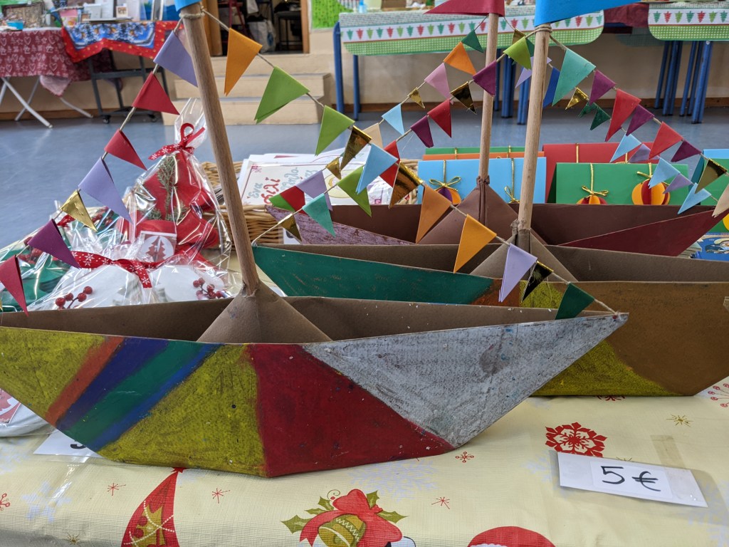 Κατασκευάσαμε χριστουγεννιάτικα καράβια με χαρτιά τύπου canson διαστάσεων 50×70 εκ. Τα χρωματίσαμε με λαδοπαστέλ και τα στολίσαμε με χρωματιστά σημαιάκια από χαρτί τύπου canson.