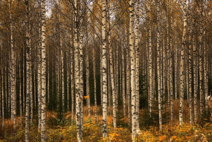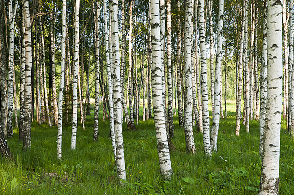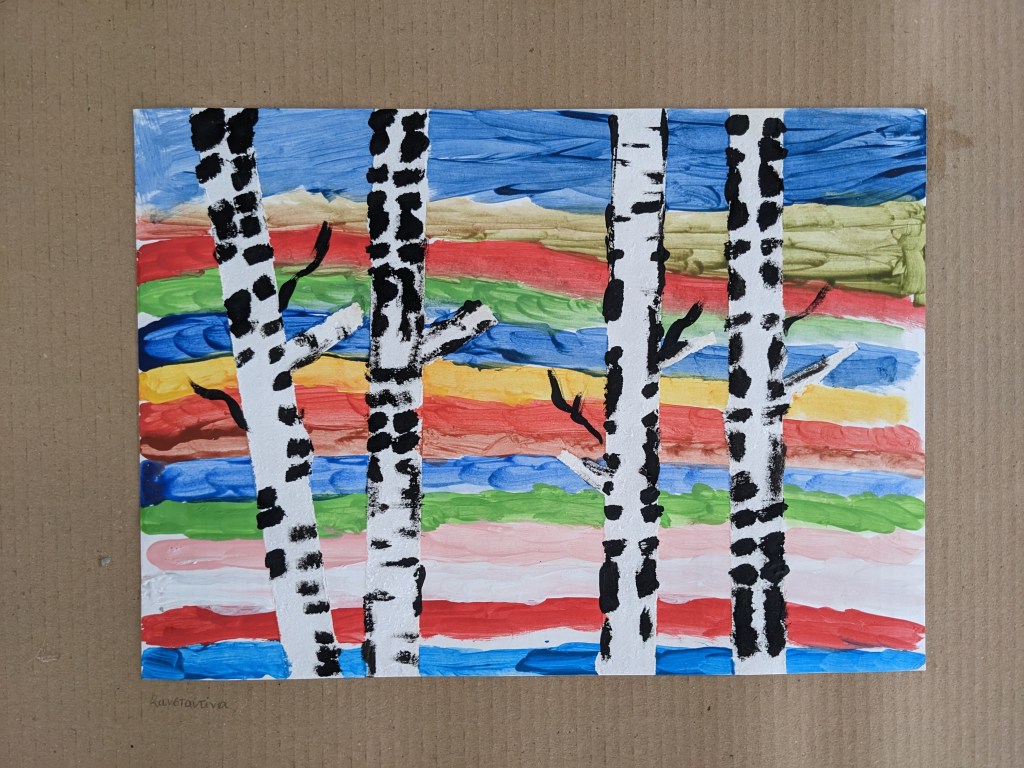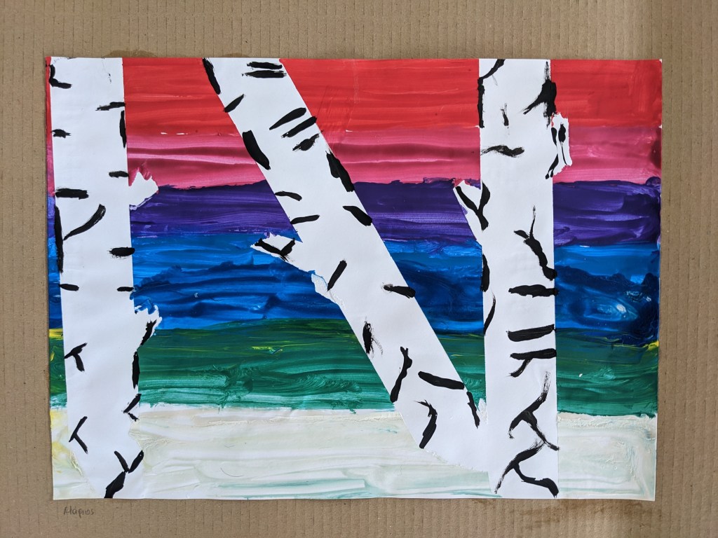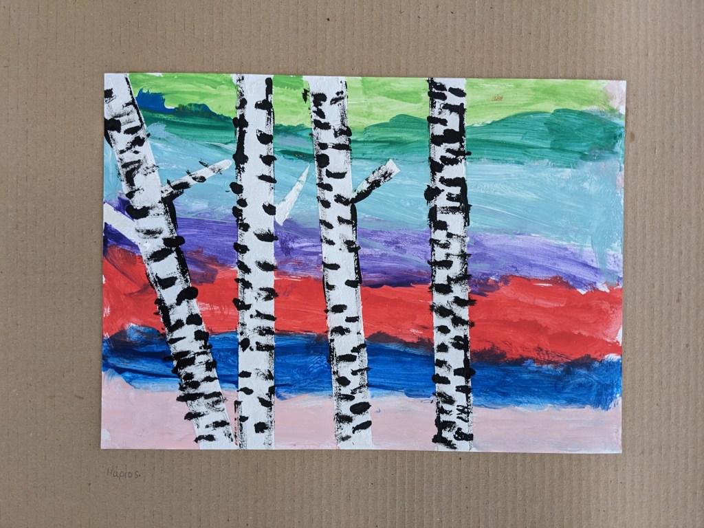 Οι μαθητές παρατήρησαν φωτογραφίες δασών με σημύδες. Εστιάσαμε στους ασυνήθιστους λευκούς κορμούς με τα μαύρα σχέδια.