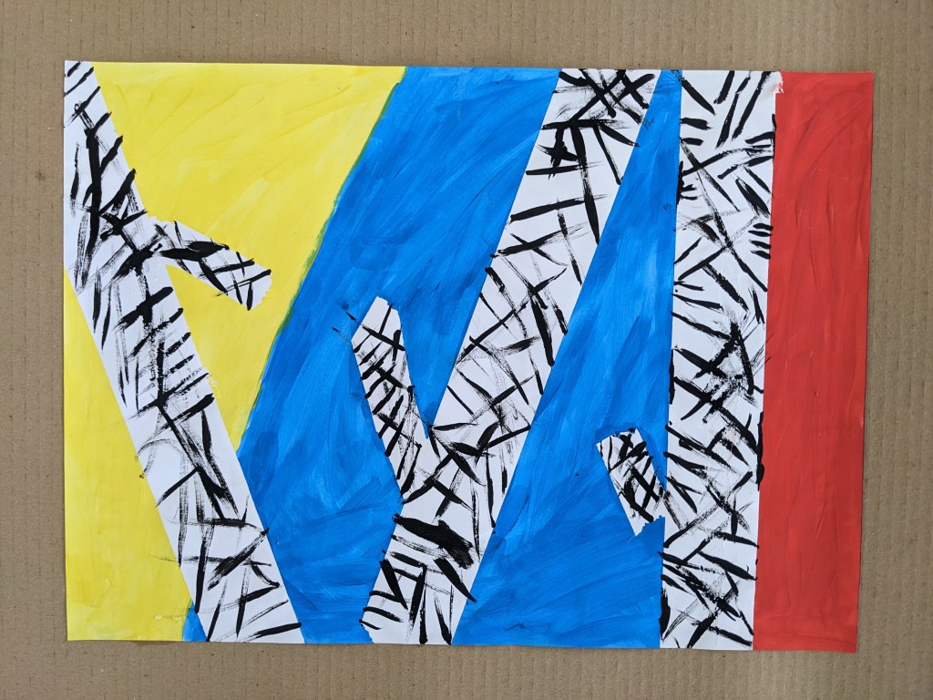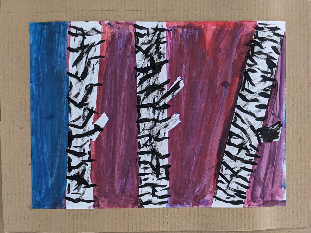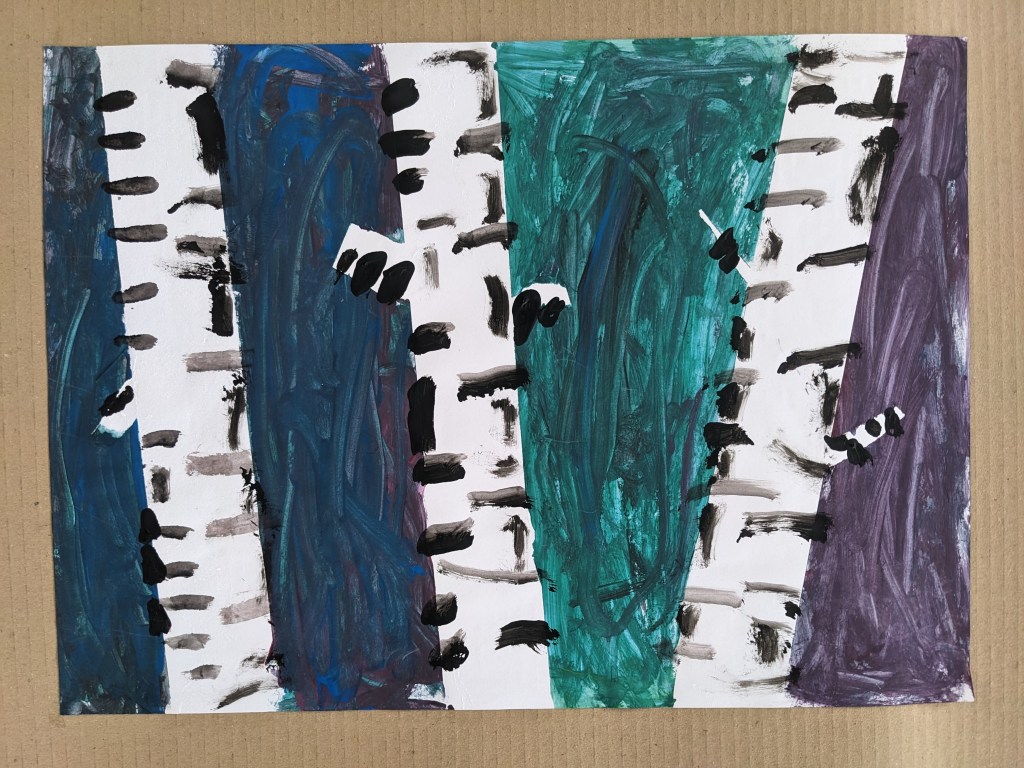 Στη συνέχεια οι μαθητές σχημάτισαν, σε χαρτί ακουαρέλας, κορμούς και κλαδιά με χαρτοταινία. Χρωμάτισαν ελεύθερα το φόντο με τέμπερες και όταν στέγνωσε αφαίρεσαν τη χαρτοταινία και ολοκλήρωσαν το έργο τους με μαύρα σχέδια στους κορμούς.