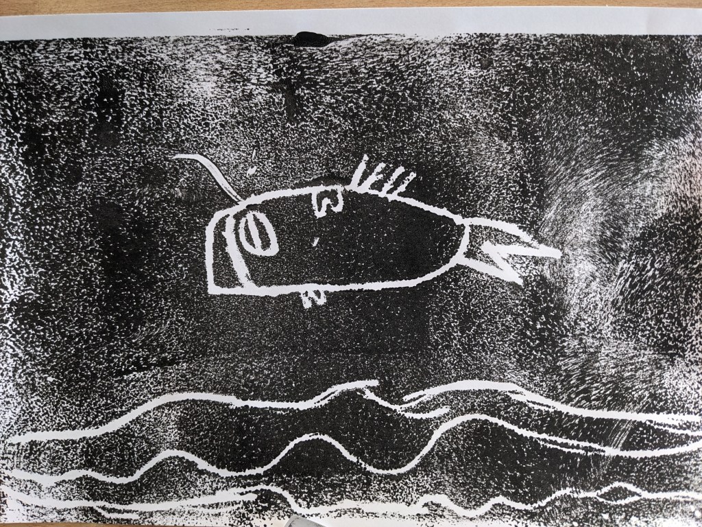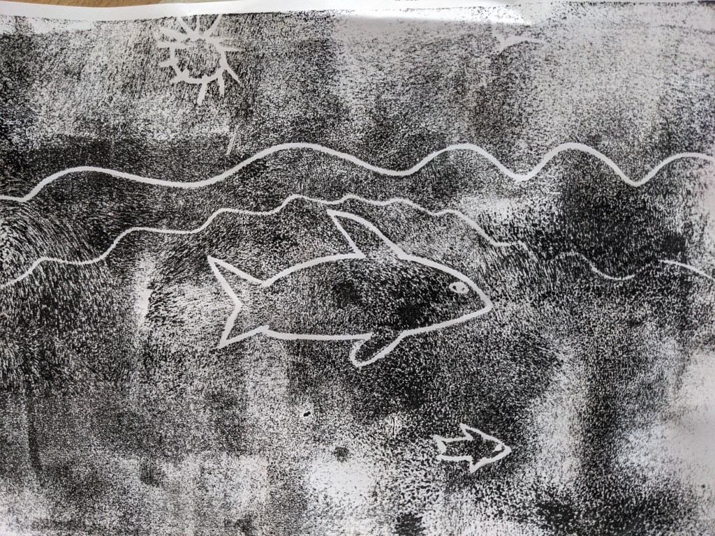 Γνωρίσαμε το έργο του Escher και μιλήσαμε για την τέχνη της χαρακτικής. Στη συνέχεια οι μαθητές παρακολούθησαν ένα βίντεο animation στο οποίο ζωντανεύει το έργο του Έσερ “Sky and Water I” , ξεφύλλισαν βιβλία με χαρακτικά του Έσερ, περιεργαστήκαν μήτρες και εργαλεία χαρακτικής. Σχεδίασαν με μολύβι σε αφρώδη φύλλα Α4 τη δική τους εικόνα με έμπνευση από το έργο “Sky and Water I” και την τύπωσαν σε λευκό χαρτί εκτύπωσης.