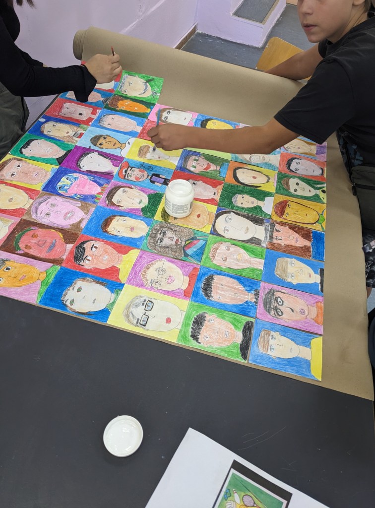 Οι μαθητές κολλούν τα ολοκληρωμένα πορτρέτα σε χαρτί του μέτρου με ξυλλόκολλα την οποία χρησιμοποιούν και ως επίστρωση για την σταθεροποίηση του κολάζ.