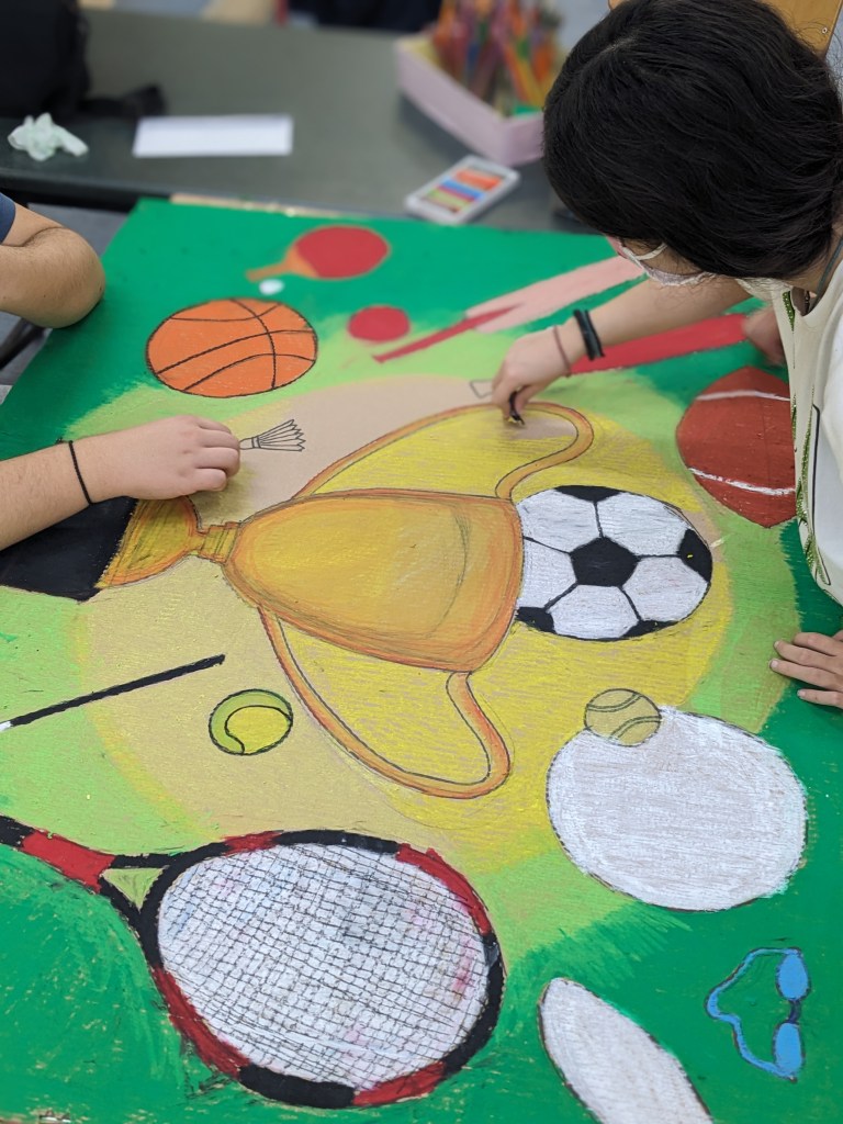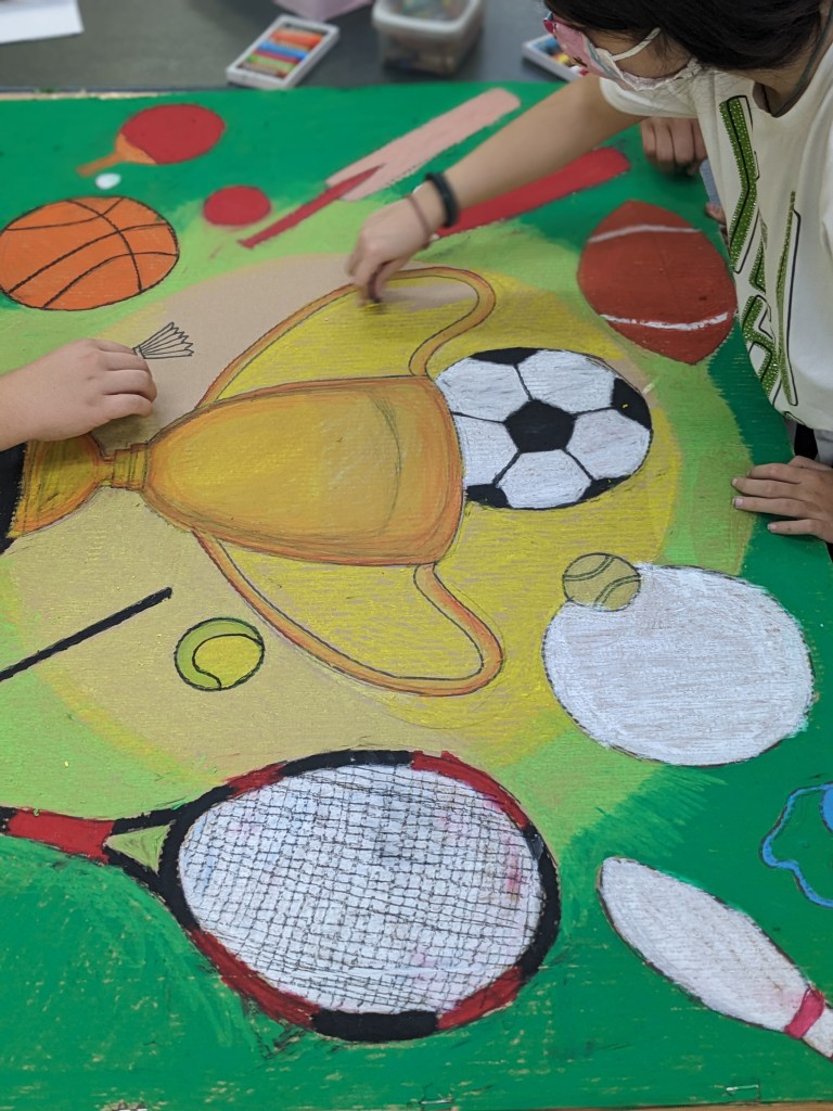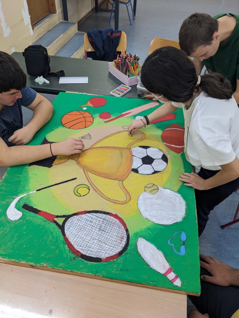 Με αφορμή τη δημιουργία ενός έργου για την 10η Πανελλήνια Ημέρα Σχολικού Αθλητισμού πειραματιστήκαμε με ένα νέο υλικό, τα λαδοπαστέλ. Αναζητήσαμε σχετικές εικόνες στο διαδίκτυο και καταλήξαμε σε μια με έντονα χρώματα την οποία και σχεδιάσαμε σε χοντρό χαρτόνι και χρωματίσαμε αναμειγνύοντας λαδοπαστέλ για την απόδοση χρωματικών τόνων και αποχρώσεων.