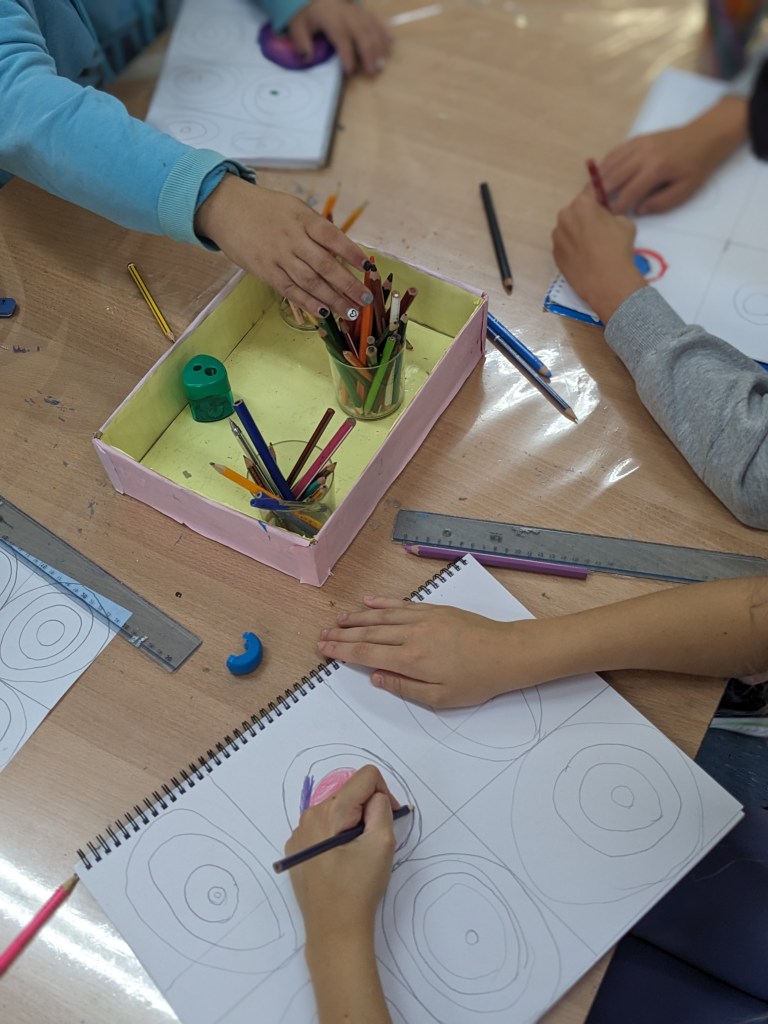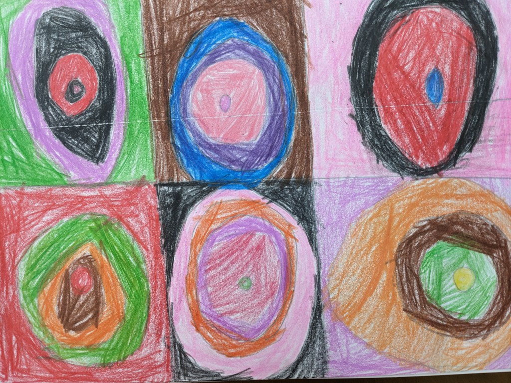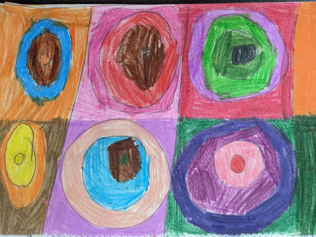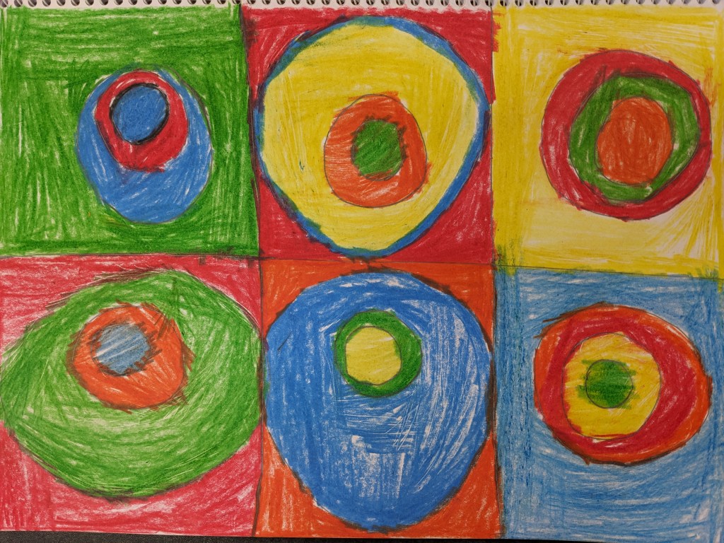 Γνωρίσαμε τον ζωγράφο Βασίλι Καντίνσκι μέσα από εικόνες και σταθήκαμε στο έργο του “Σπουδή χρωμάτων”. Με αφορμή αυτό το έργο μιλήσαμε για τα χρώματα, τη μουσική και τα συναισθήματα που εκφράζουμε μέσα απο τα χρώματα. Στη συνέχεια, χωρίσαμε το χαρτί μας σε τετράγωνα και ζωγραφίσαμε ομόκεντρους χρωματιστούς κύκλους με ξυλομπογιές και νερομπογιές.