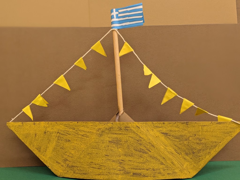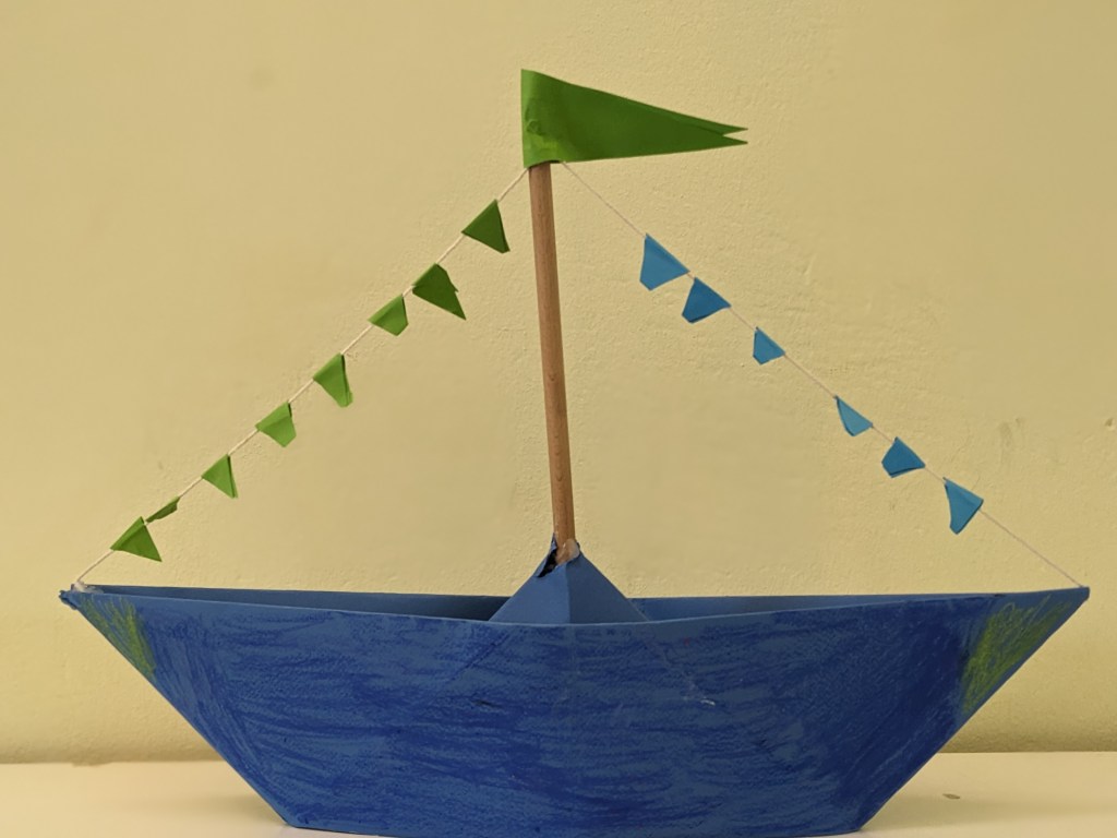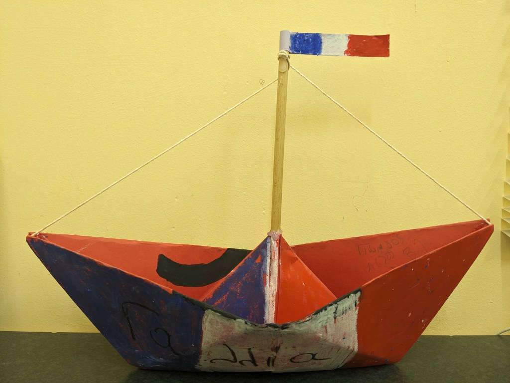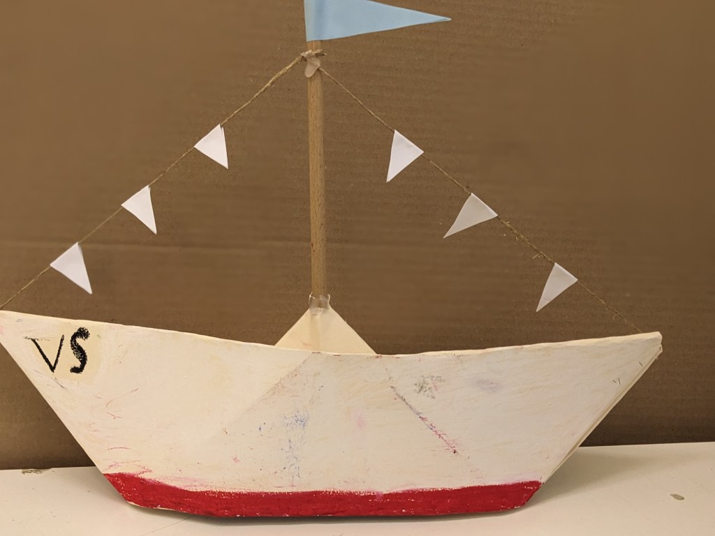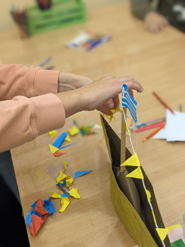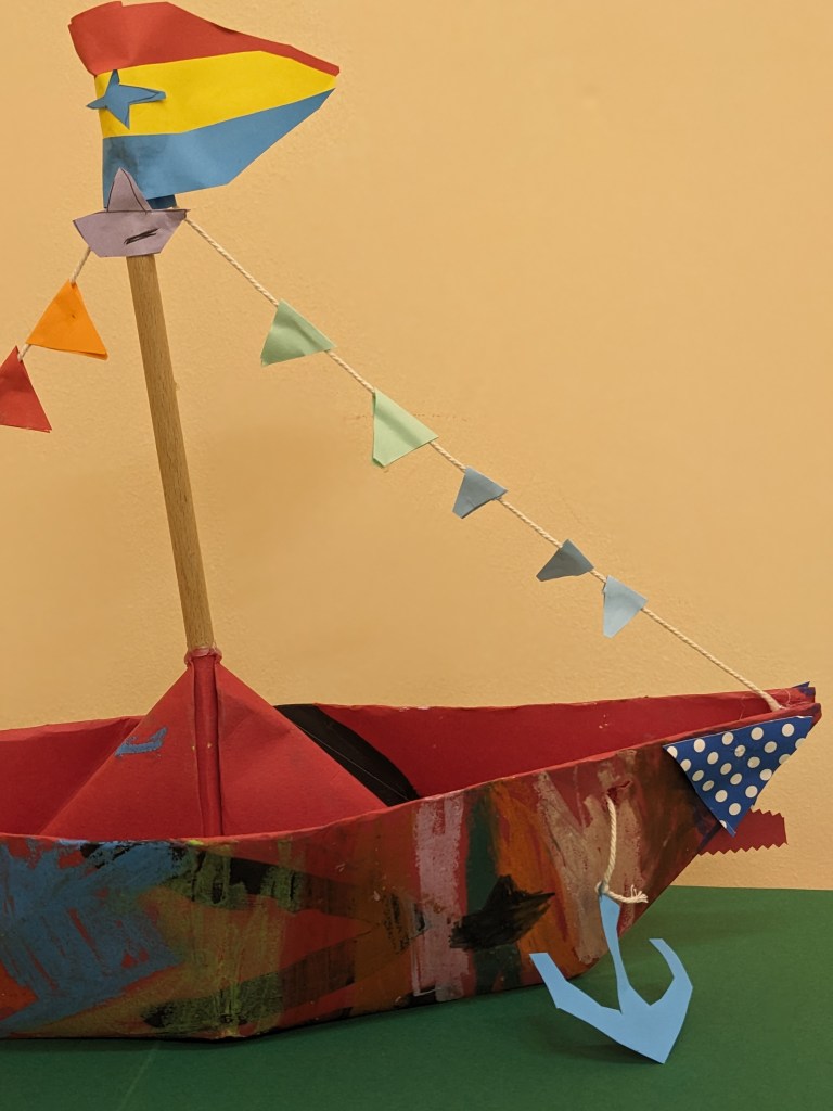 Κατασκευάσαμε χάρτινα καράβια με χαρτιά τύπου canson διαστάσεων 50×70 εκ. Τα χρωματίσαμε με λαδοπαστέλ και τα στολίσαμε με χρωματιστά σημαιάκια από χαρτί τύπου canson.