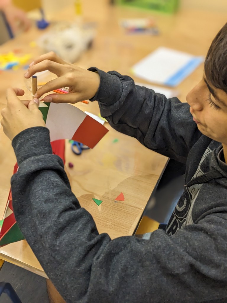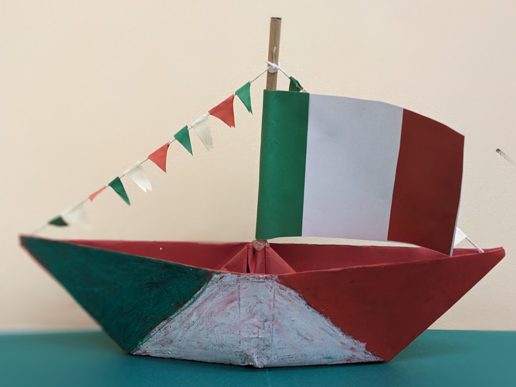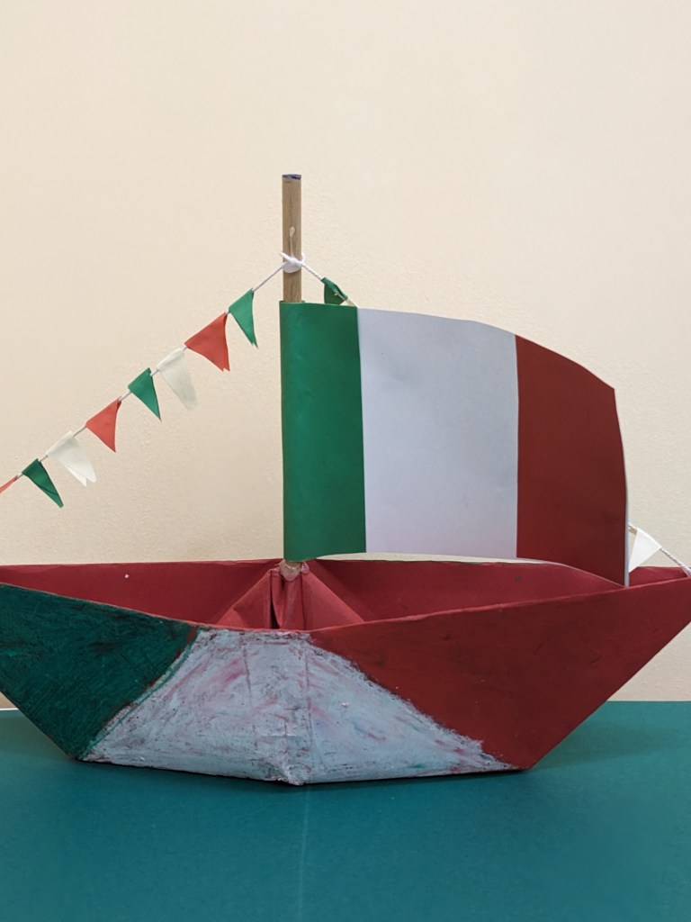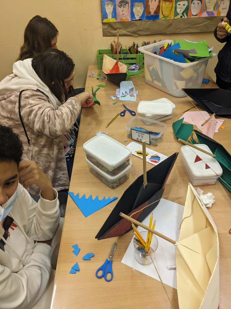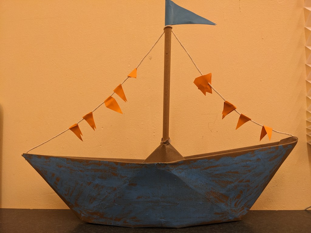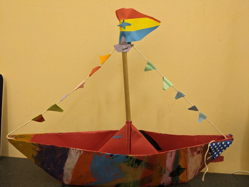 Κατασκευάσαμε χάρτινα καράβια με χαρτιά τύπου canson διαστάσεων 50×70 εκ. Τα χρωματίσαμε με λαδοπαστέλ και τα στολίσαμε με χρωματιστά σημαιάκια από χαρτί τύπου canson.