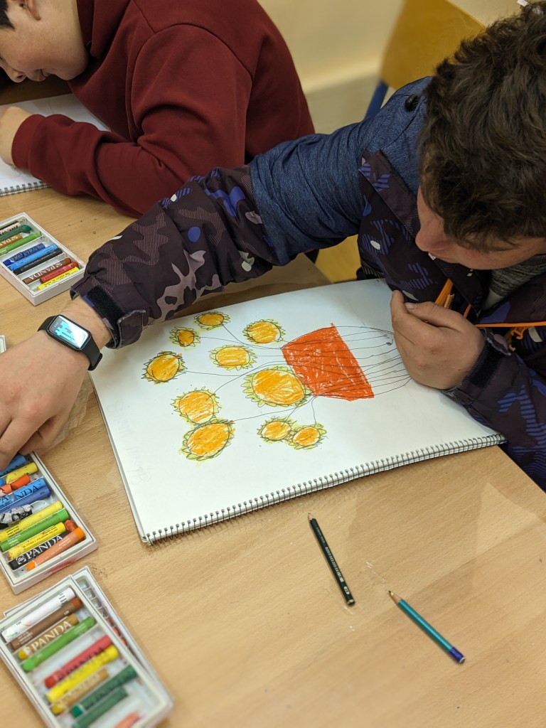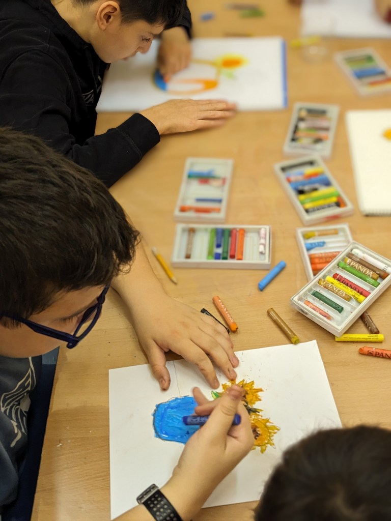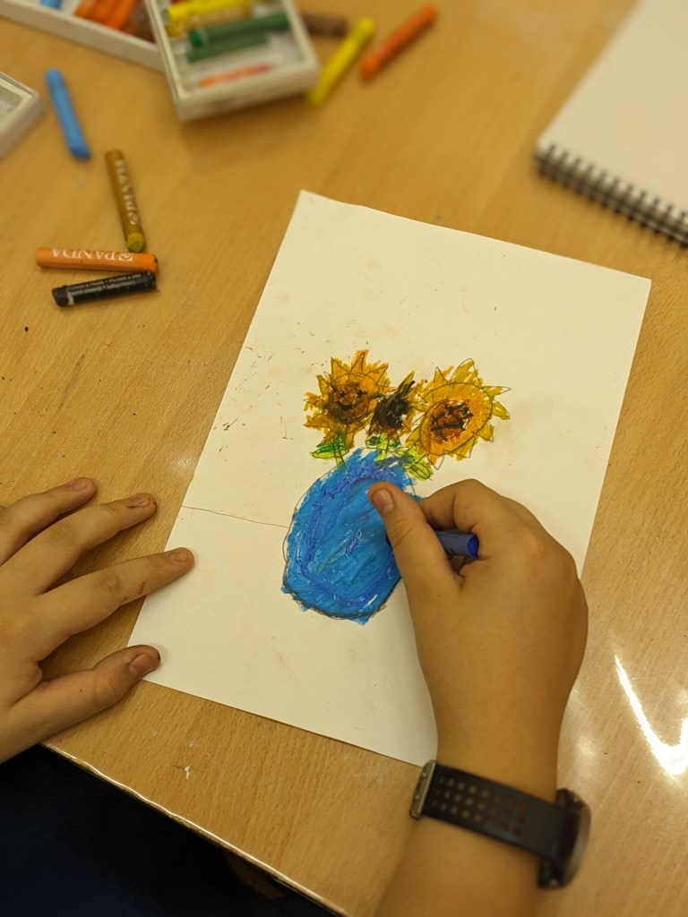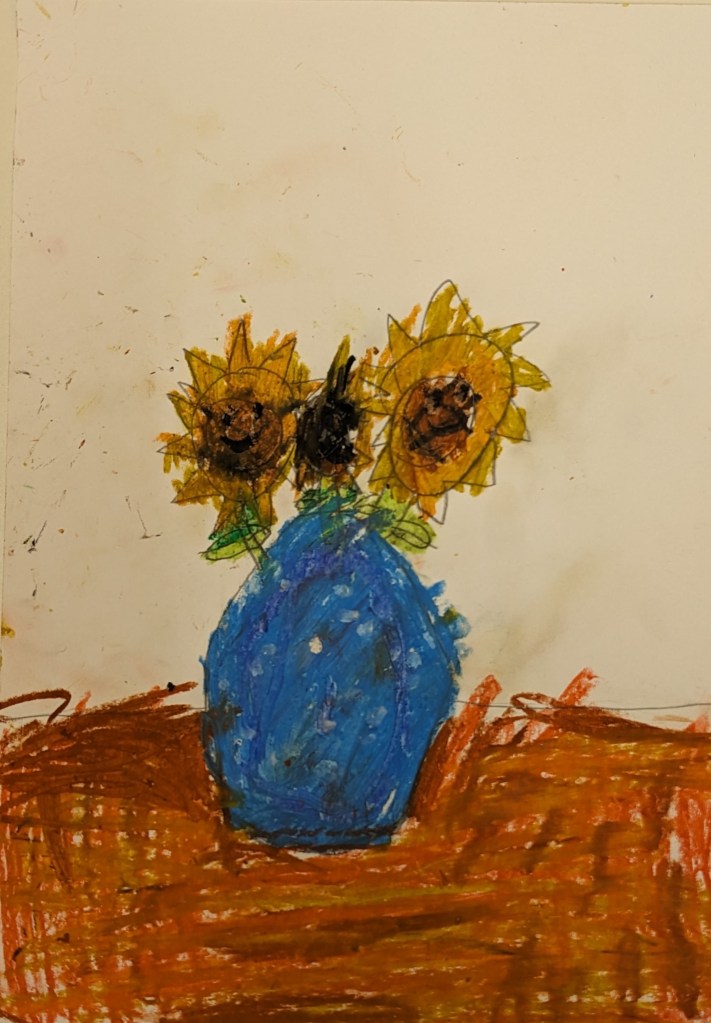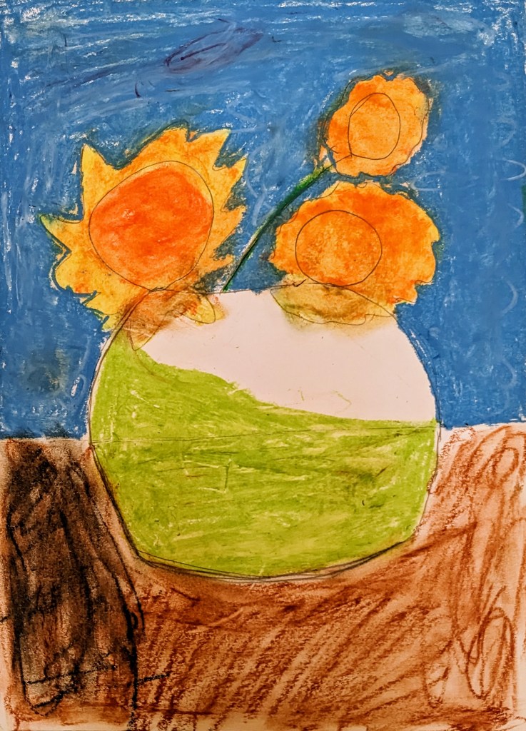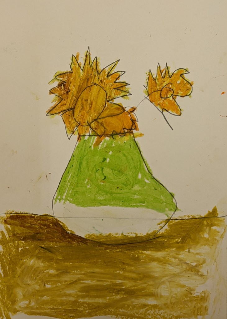 Μιλήσαμε για τη ζωή και το έργο του καλλιτέχνη Βίνσεντ βαν Γκογκ. Στη συνέχεια, με αφορμή τα έργα του με βάζα οι μαθητές σχεδίασαν το δικό τους βάζο. Χρωμάτισαν με λαδοπαστέλ.