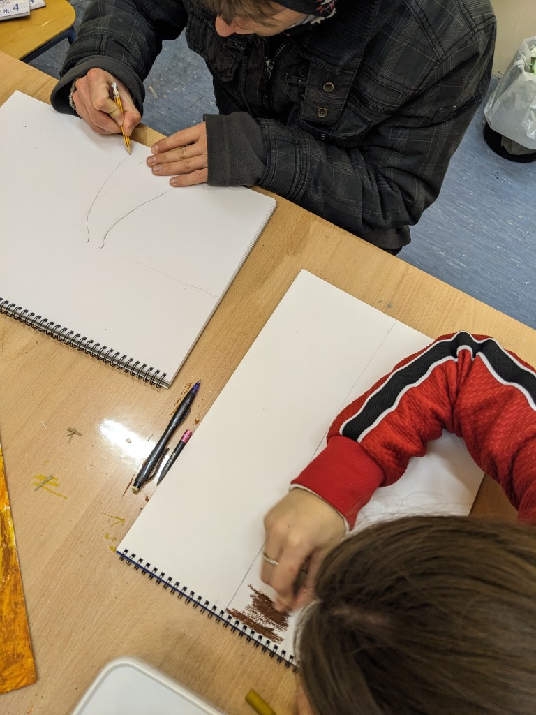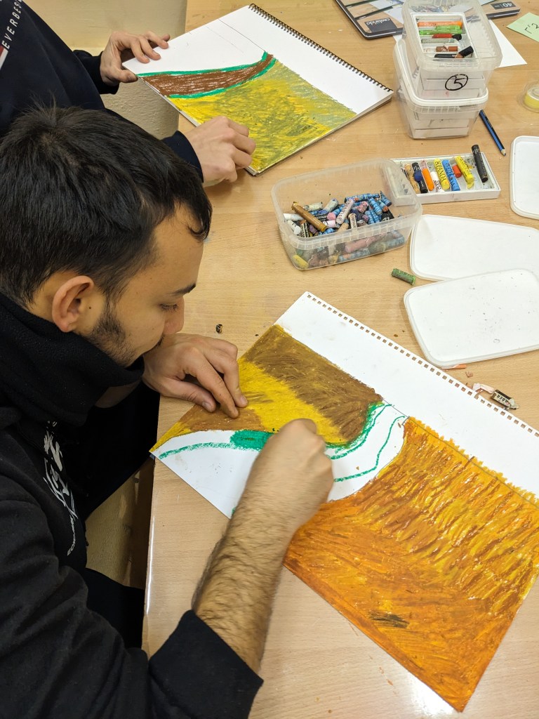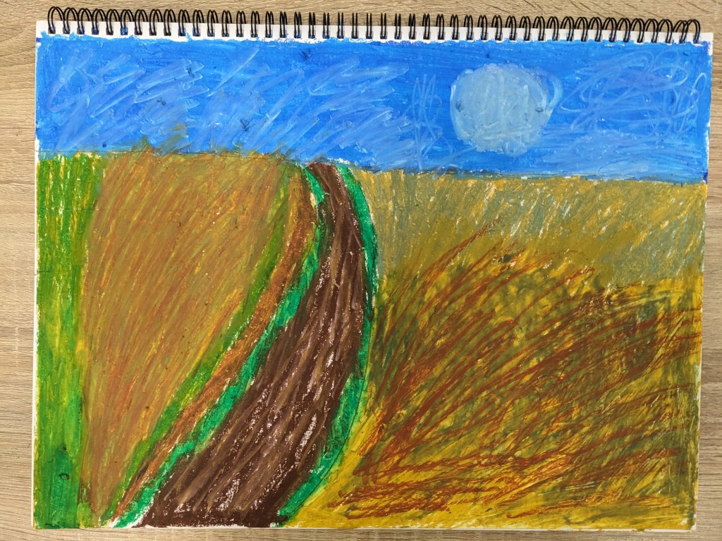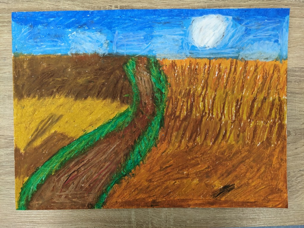 Μιλήσαμε για τη ζωή και το έργο του Βίνσεντ βαν Γκογκ. Μελετήσαμε τον πίνακα “Σιτοχώραφο με κοράκια” που εικάζεται πως ήταν και ο τελευταίος του. Παρατηρήσαμε τις έντονες πινελιές στα έργα του που δίνουν την αίσθηση της κίνησης. Στη συνέχεια, σχεδιάσαμε με μολύβι τη γραμμή του ορίζοντα και τον δρόμο (δίνοντας την αίσθηση του βάθους στην εικόνα). Χρωματίσαμε με λαδοπαστέλ χρησιμοποιώντας τα χρώματα του πίνακα του βαν Γκογκ.