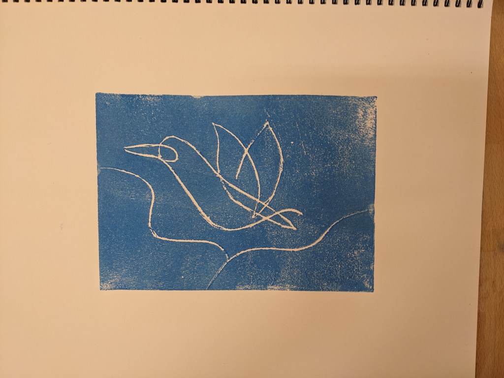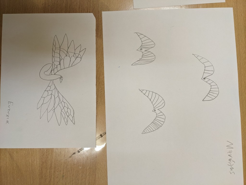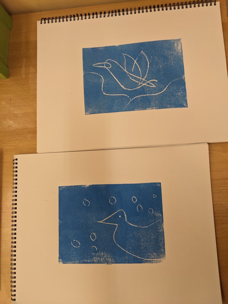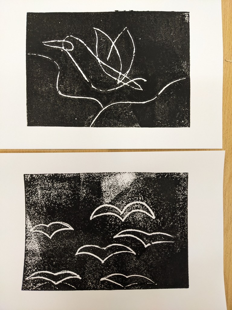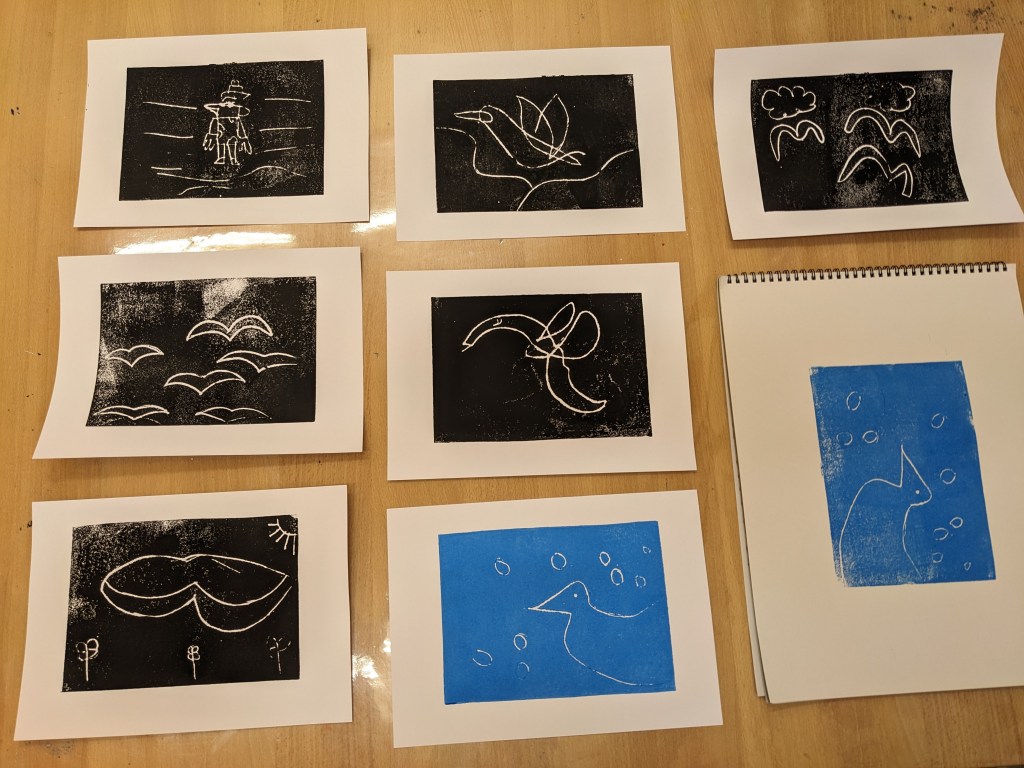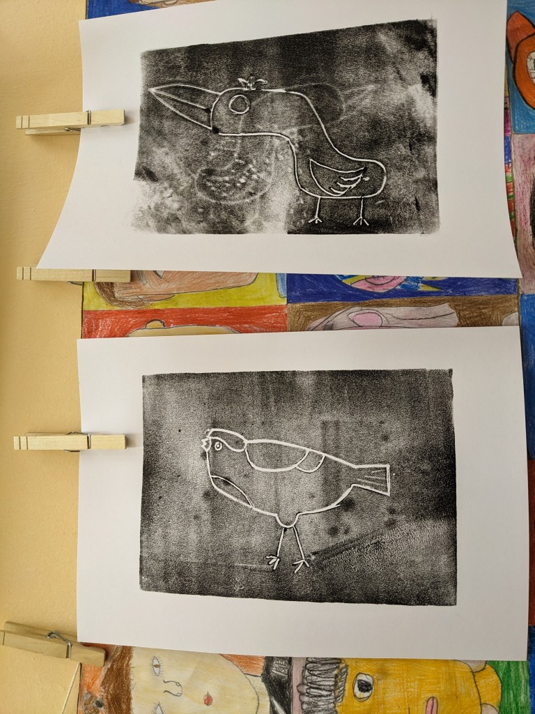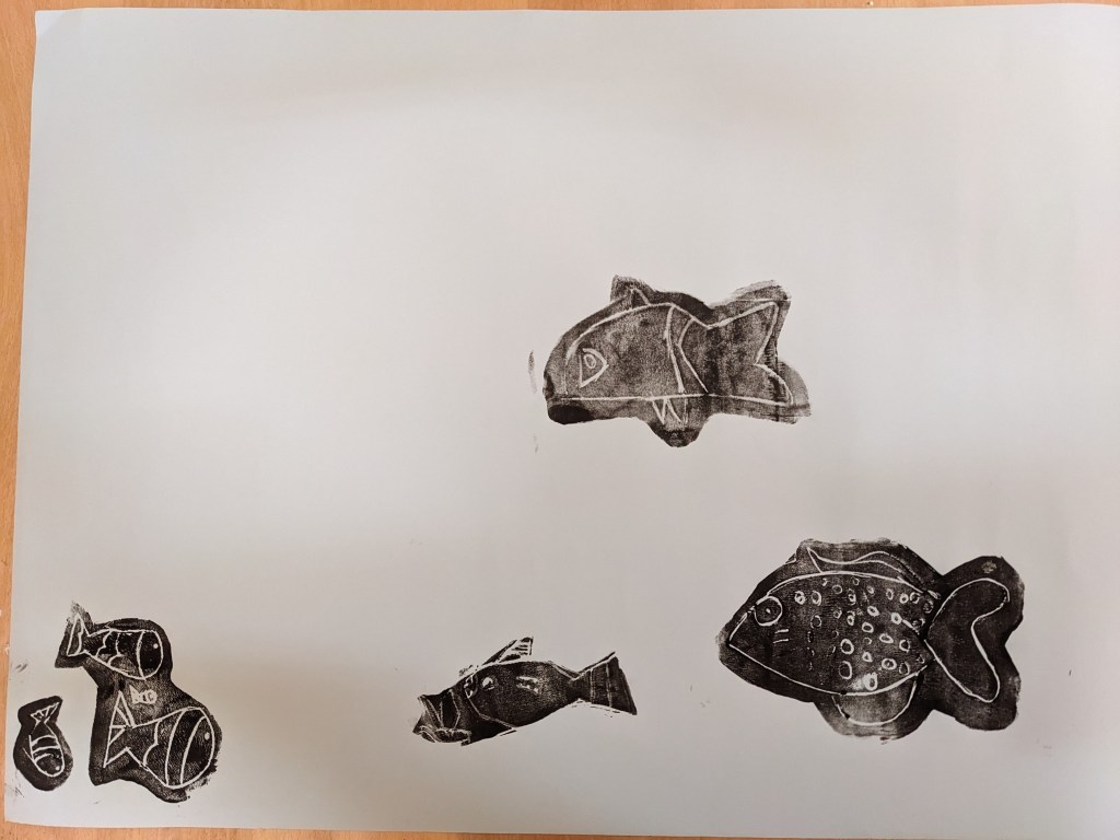 Γνωρίσαμε το έργο του Escher και μιλήσαμε για την τέχνη της χαρακτικής. Στη συνέχεια οι μαθητές παρακολούθησαν ένα βίντεο animation στο οποίο ζωντανεύει το έργο του Έσερ “Sky and Water I”, ξεφύλλισαν βιβλία με χαρακτικά του Έσερ, περιεργαστήκαν μήτρες και εργαλεία χαρακτικής. Σχεδίασαν με μολύβι σε αφρώδη φύλλα Α4 τη δική τους εικόνα με έμπνευση από το έργο “Sky and Water I” και την τύπωσαν σε λευκό χαρτί εκτύπωσης.