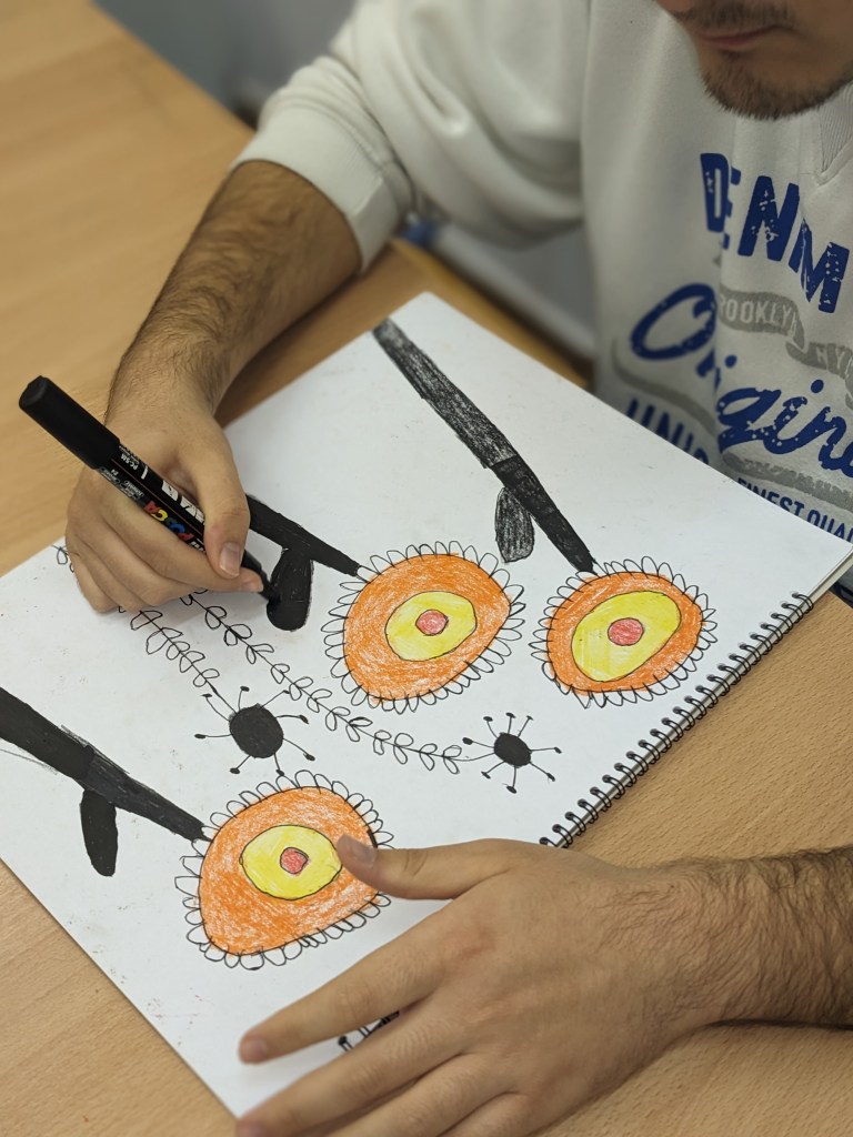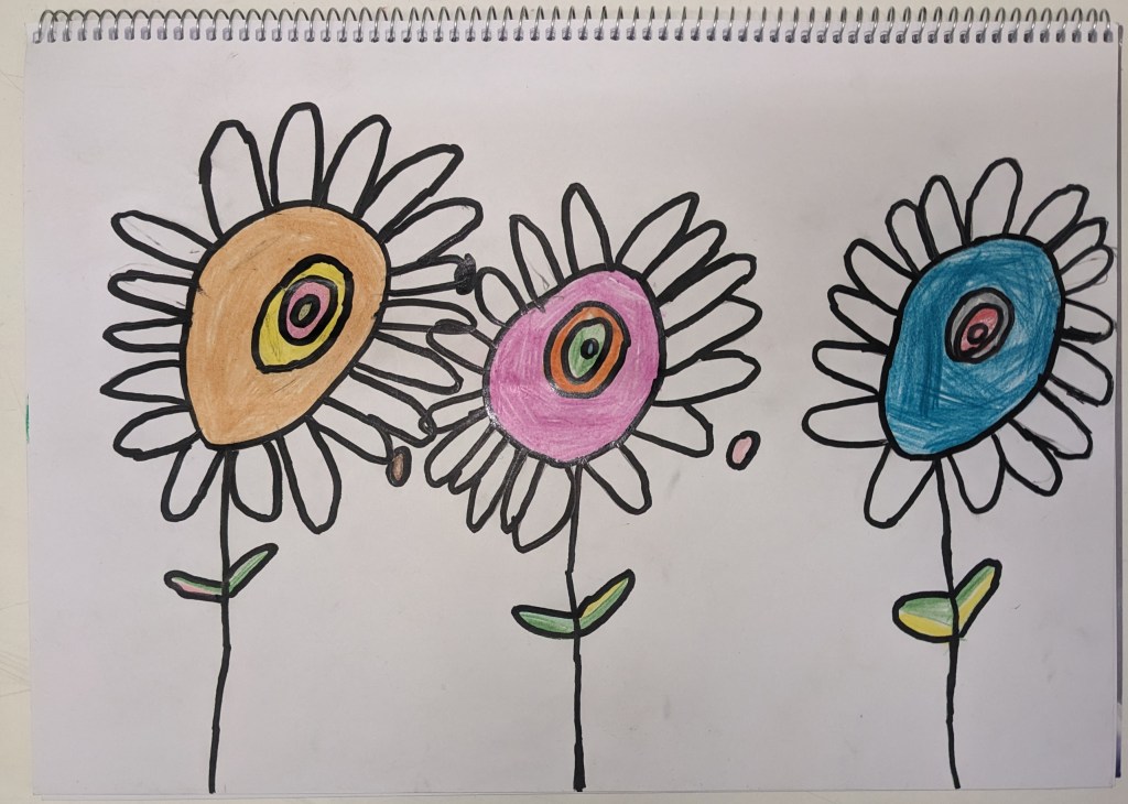 Γνωρίσαμε, μέσα από εικόνες, τον ζωγράφο Βασίλι Καντίνσκι και σταθήκαμε στο έργο του “Σπουδή χρωμάτων”. Με αφορμή αυτό το έργο μιλήσαμε για τα χρώματα, τη μουσική καθώς και τα συναισθήματα που εκφράζουμε μέσα από τα χρώματα. Στη συνέχεια, ζωγραφίσαμε ομόκεντρους κύκλους – λουλούδια με ξυλομπογιές και μαρκαδόρους .