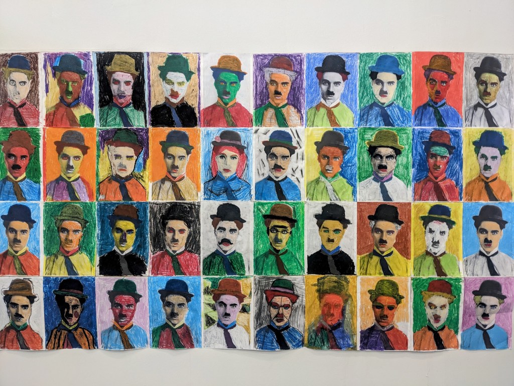 Με αφορμή μια φωτογραφία του Τσάρλι Τσάπλιν μιλήσαμε για τα πρόσωπα και τις διαφορετικές εκφράσεις τους στον κινηματογράφο. Στη συνέχεια, μεταμορφώσαμε μια φωτογραφία του Τσάρλι Τσάπλιν χρησιμοποιώντας λαδοπαστέλ. Επίσης, είδαμε τις προσωπογραφίες του Αντι Γουόρχολ και είπαμε λίγα πράγματα για το κίνημα της ποπ αρτ.