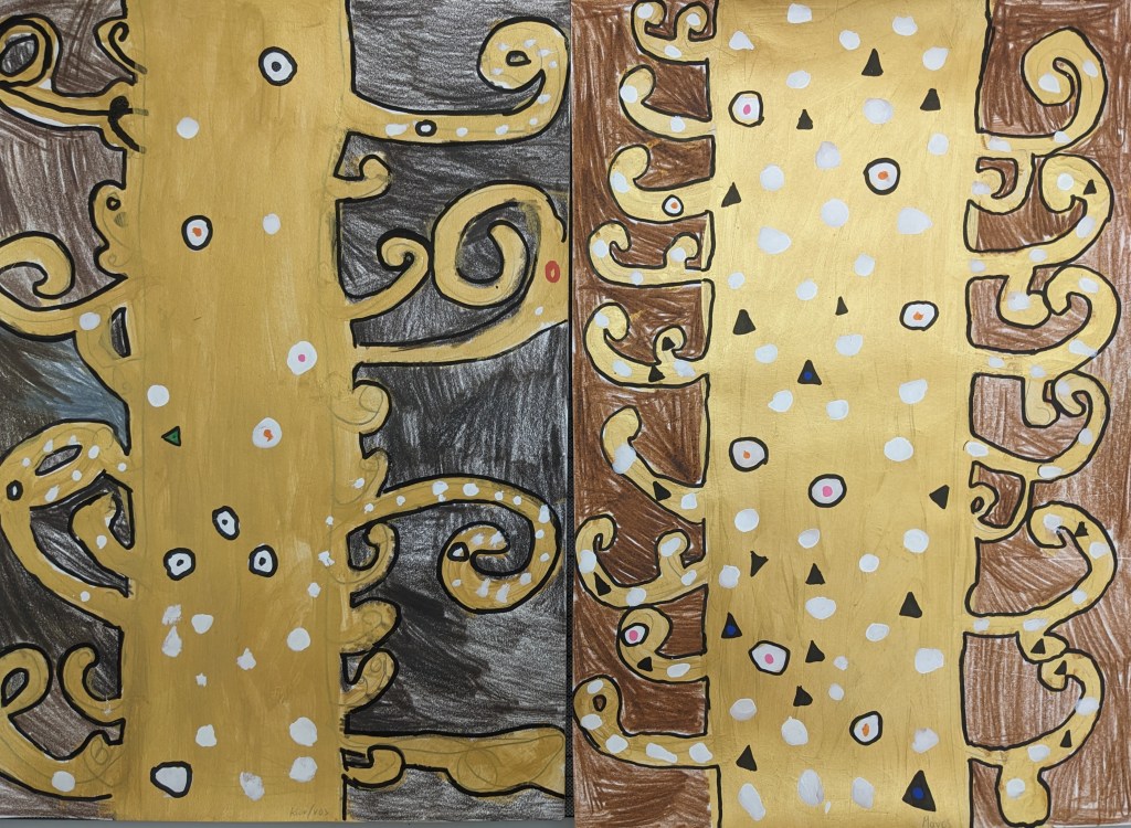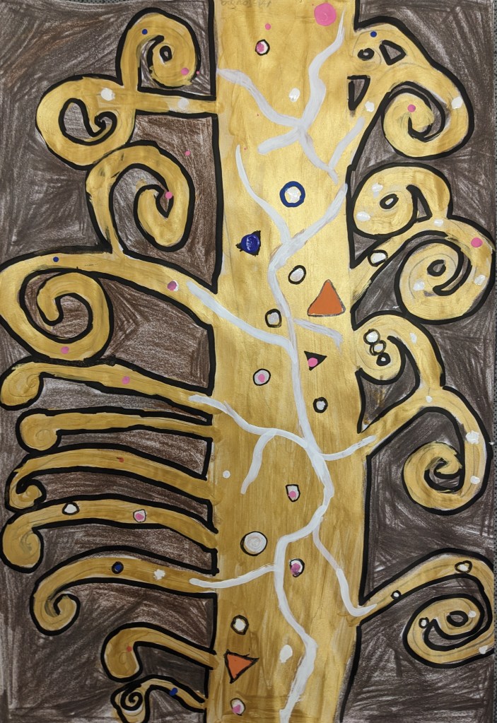 Στο μάθημα των Καλλιτεχνικών μιλήσαμε για τη ζωή και το έργο του Γκούσταφ Κλιμτ. Εστιάσαμε ιδιαίτερα στο έργο του Το Δέντρο της Ζωής και συζητήσαμε για τα σύμβολα, τα χρώματα και τα διακοσμητικά μοτίβα που χρησιμοποίησε ο καλλιτέχνης. Με αφορμή το έργο αυτό, οι μαθητές σχεδίασαν το δικό τους δέντρο, το οποίο χρωμάτισαν με χρυσή ακρυλική μπογιά, ξυλομπογιές και πρόσθεσαν λεπτομέρειες με μαρκαδόρους Posca. Μέσα από αυτή τη διαδικασία, ήρθαν σε επαφή με την έννοια της διακοσμητικής τέχνης και δημιούργησαν μοναδικές, λαμπερές συνθέσεις γεμάτες σύμβολα και φαντασία.