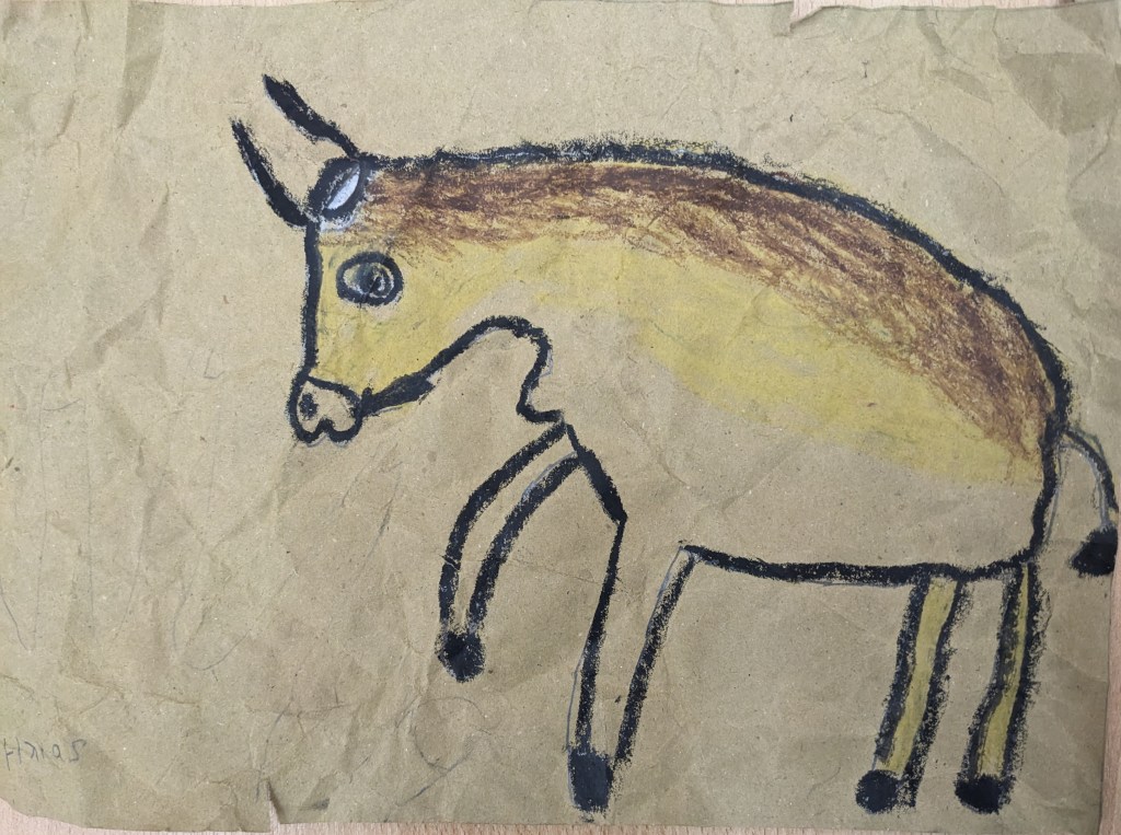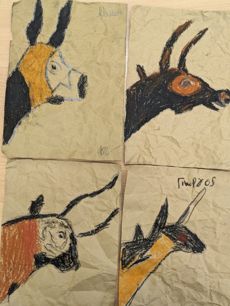 Με αφορμή τα δημιουργήματα της παλαιολιθικής εποχής, οι μαθητές εμπνεύστηκαν από εικόνες από τις βραχογραφίες του σπηλαίου του Λασκό στη Νοτιοδυτική Γαλλία και του σπηλαίου της Αλταμίρα στη Βόρεια Ισπανία.