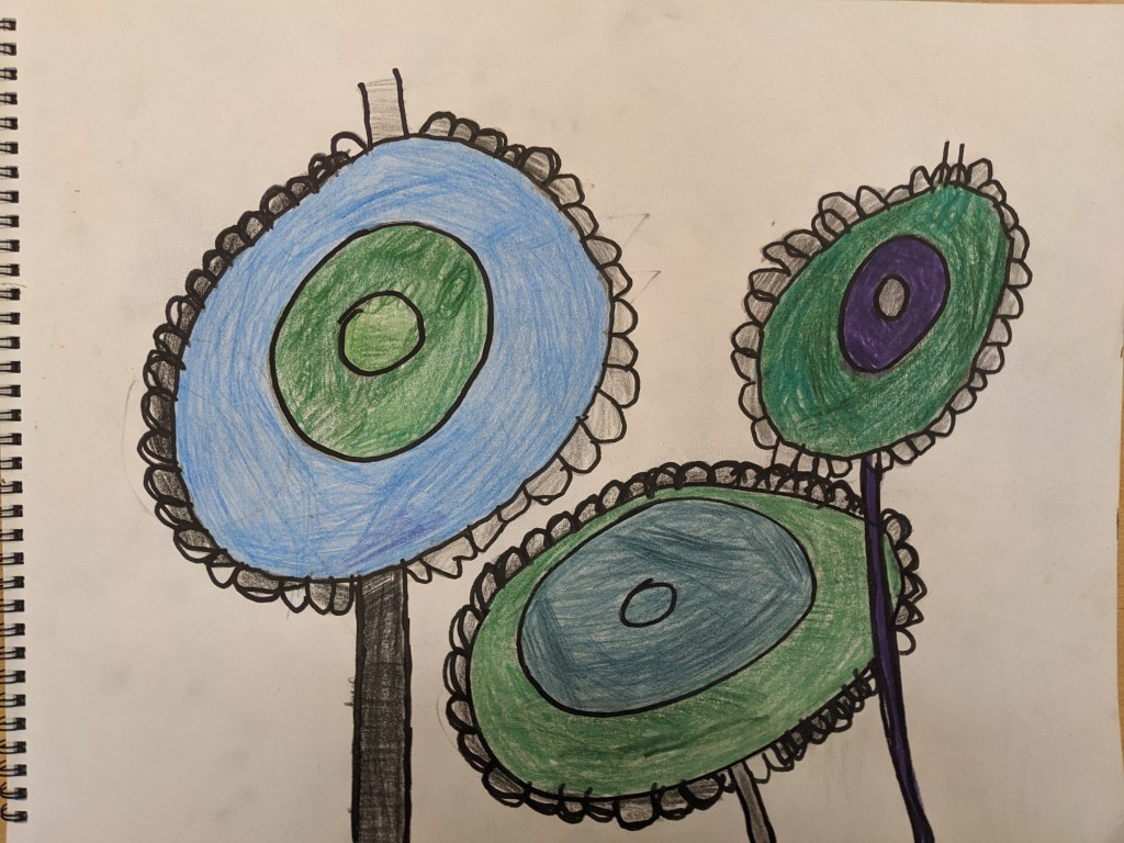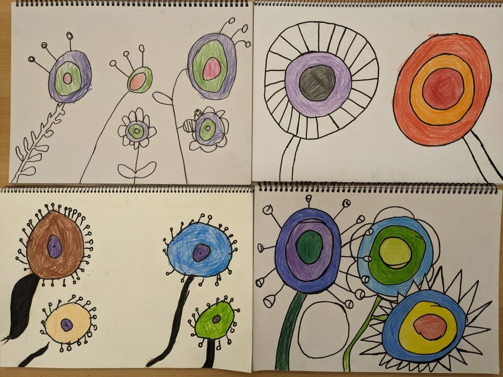 Γνωρίσαμε, μέσα από εικόνες, τον ζωγράφο Βασίλι Καντίνσκι και σταθήκαμε στο έργο του “Σπουδή χρωμάτων”. Με αφορμή αυτό το έργο μιλήσαμε για τα χρώματα, τη μουσική καθώς και τα συναισθήματα που εκφράζουμε μέσα από τα χρώματα. Στη συνέχεια, ζωγραφίσαμε ομόκεντρους κύκλους – λουλούδια με ξυλομπογιές και μαρκαδόρους .