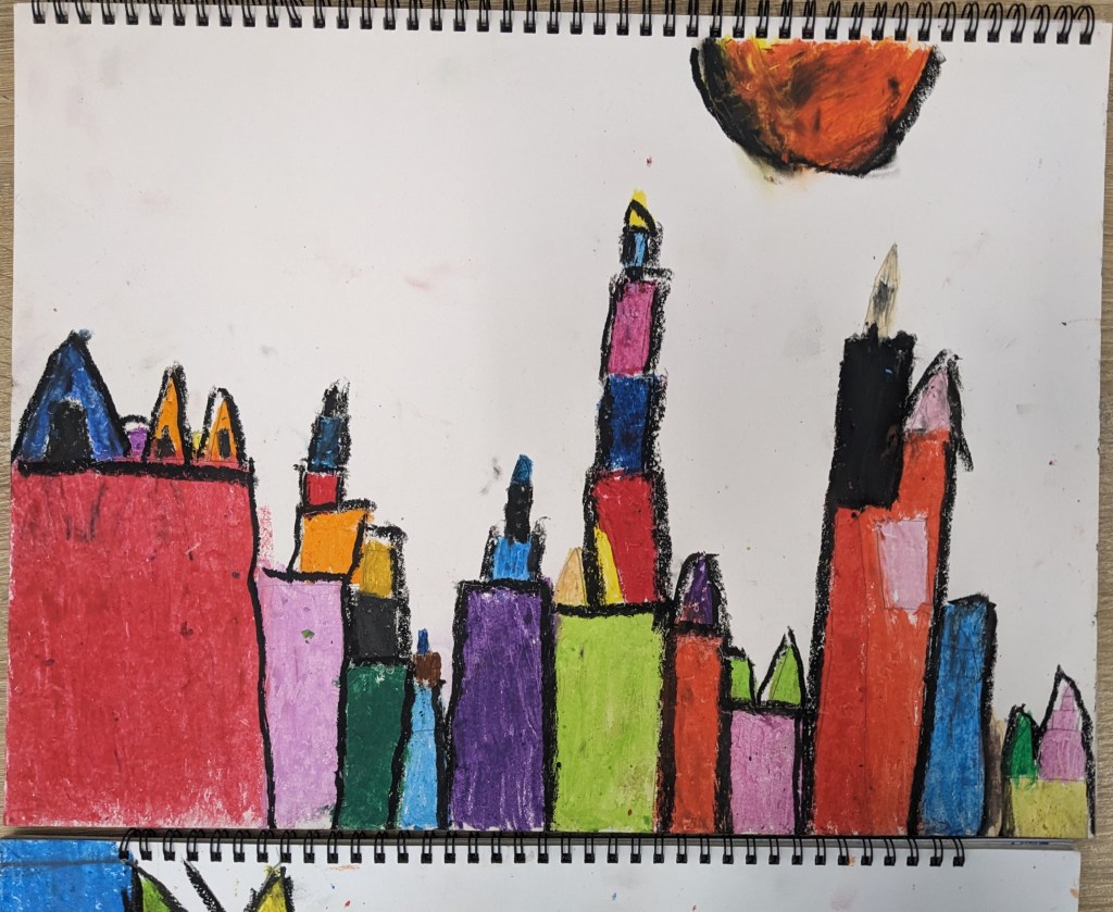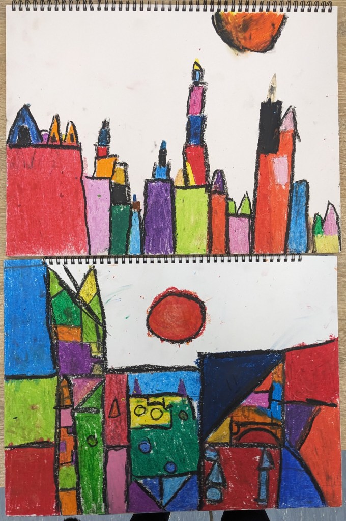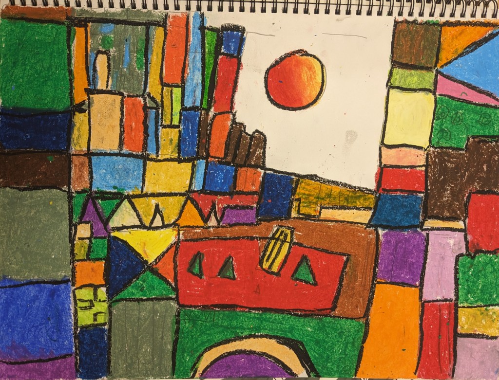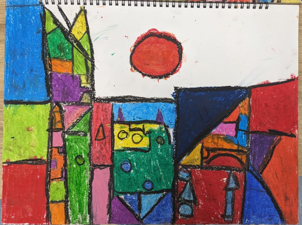Με αφορμή το βίντεο Χρωματοϊστορίες-Klee μιλήσαμε για τον σπουδαίο ζωγράφο Πάουλ Κλέε, είδαμε κάποια απο τα έργα του και σταθήκαμε περισσότερο στο πίνακα ¨Το κάστρο και ο ήλιος¨. Συζητήσαμε για τα χρώματα και τα σχήματα που χρησιμοποιεί σε αυτόν τον πίνακα ο Κλέε για να συνθέσει εικόνες. Στη συνέχεια, οι μαθητές έφτιαξαν τη δική τους εκδοχή του κάστρου με λαδοπαστέλ.