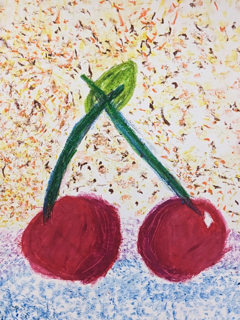 Οι μαθητές δημιούργησαν νεκρή φύση με θέμα τα κεράσια, δουλεύοντας κουκίδα-κουκίδα. Πειραματίστηκαν με τα βασικά χρώματα και παρατήρησαν πώς από μικρές, ξεχωριστές πινελιές μπορεί να προκύψει ένα ενιαίο σύνολο.